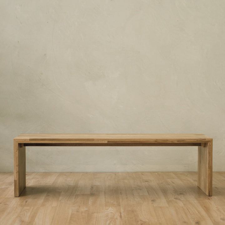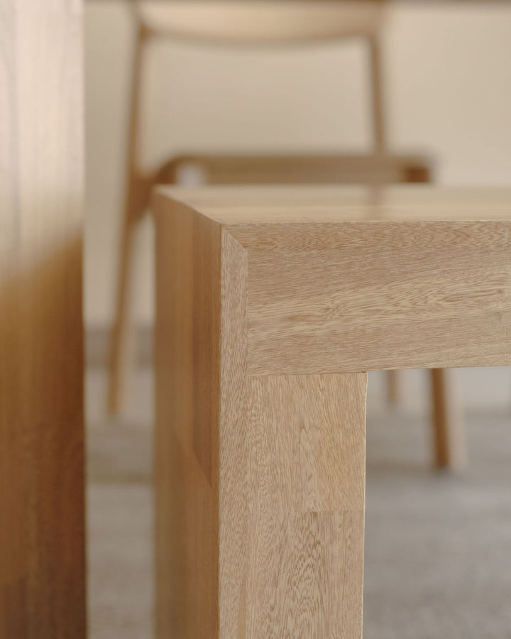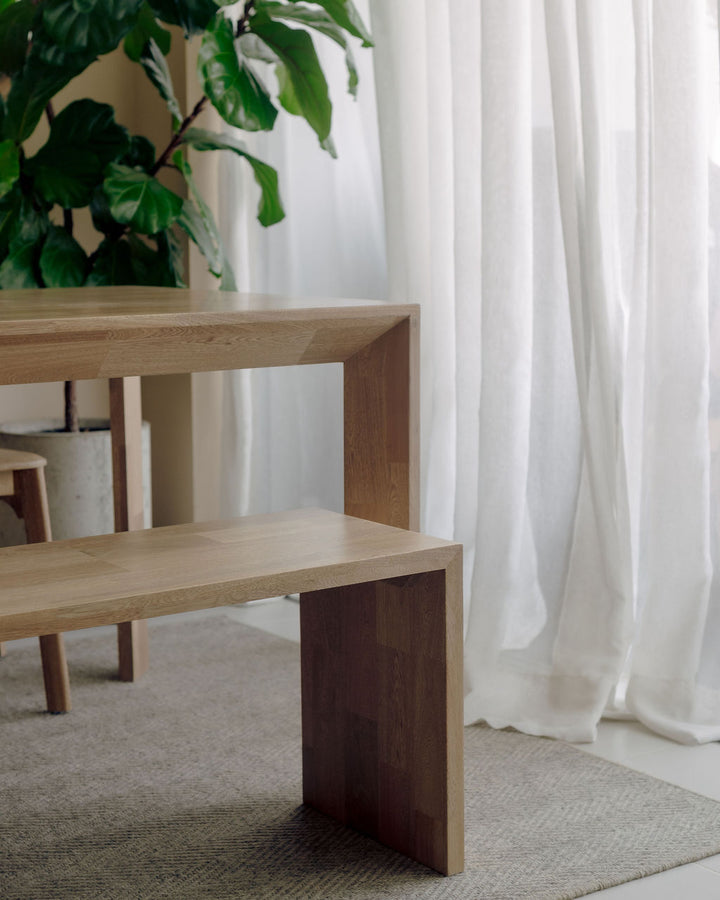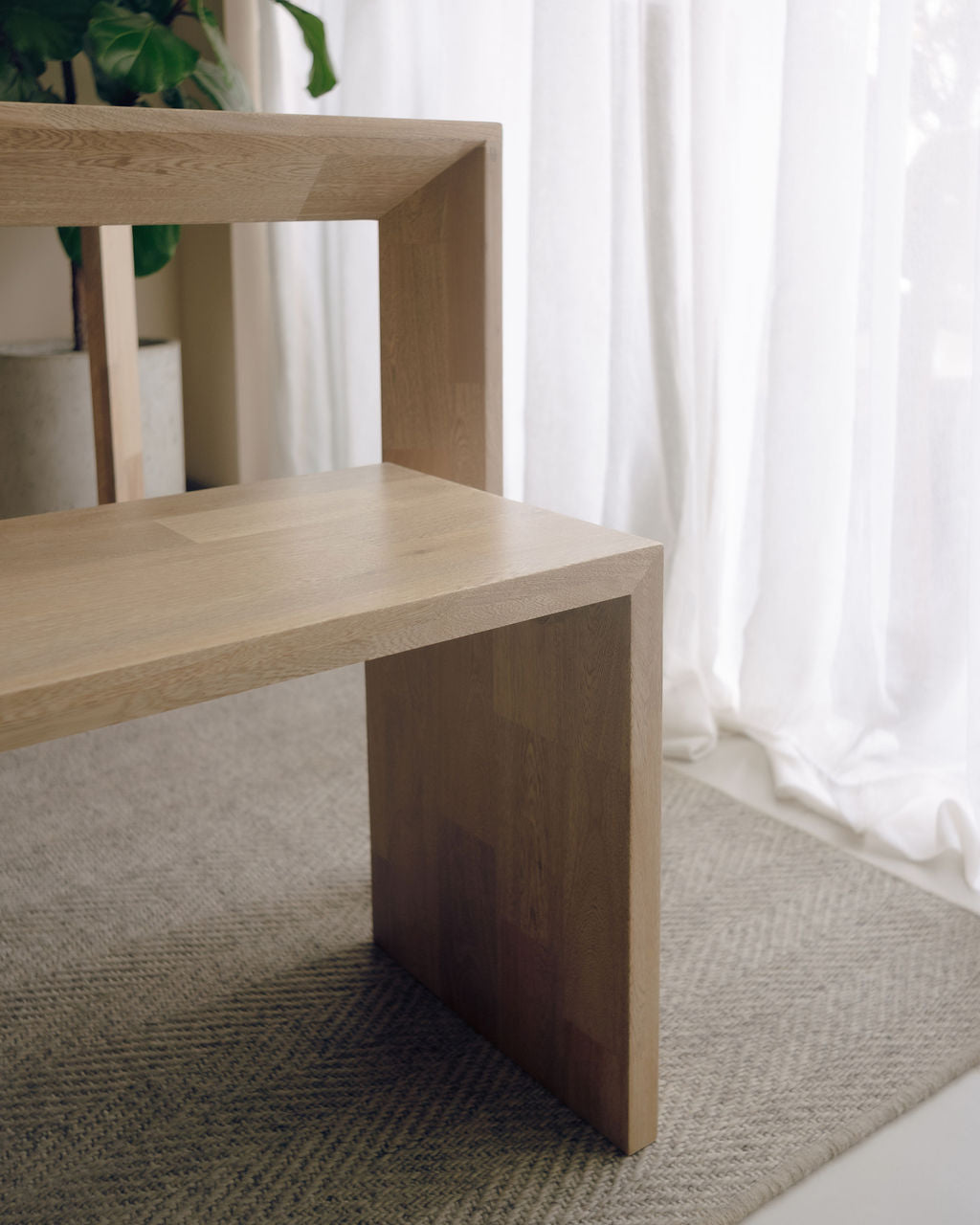 La Banca U cuenta con estructura en roble macizo y acabado natural que resalta la veta del material y la hace adecuada para uso en interiores.