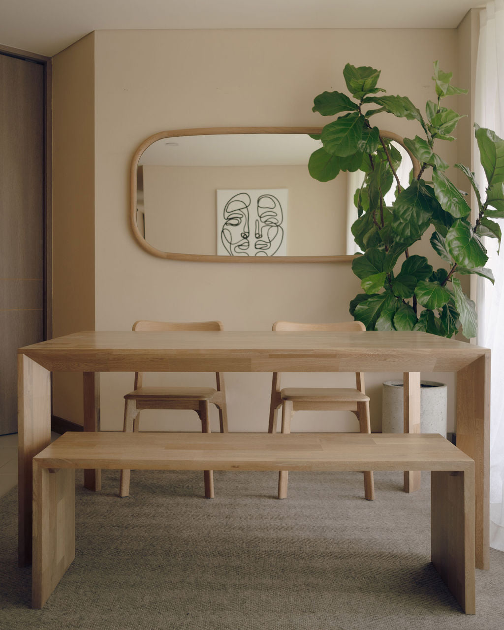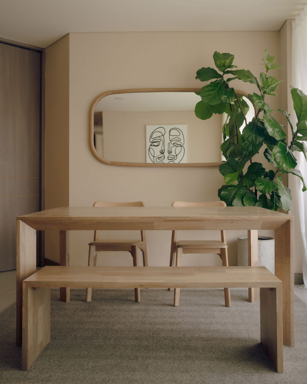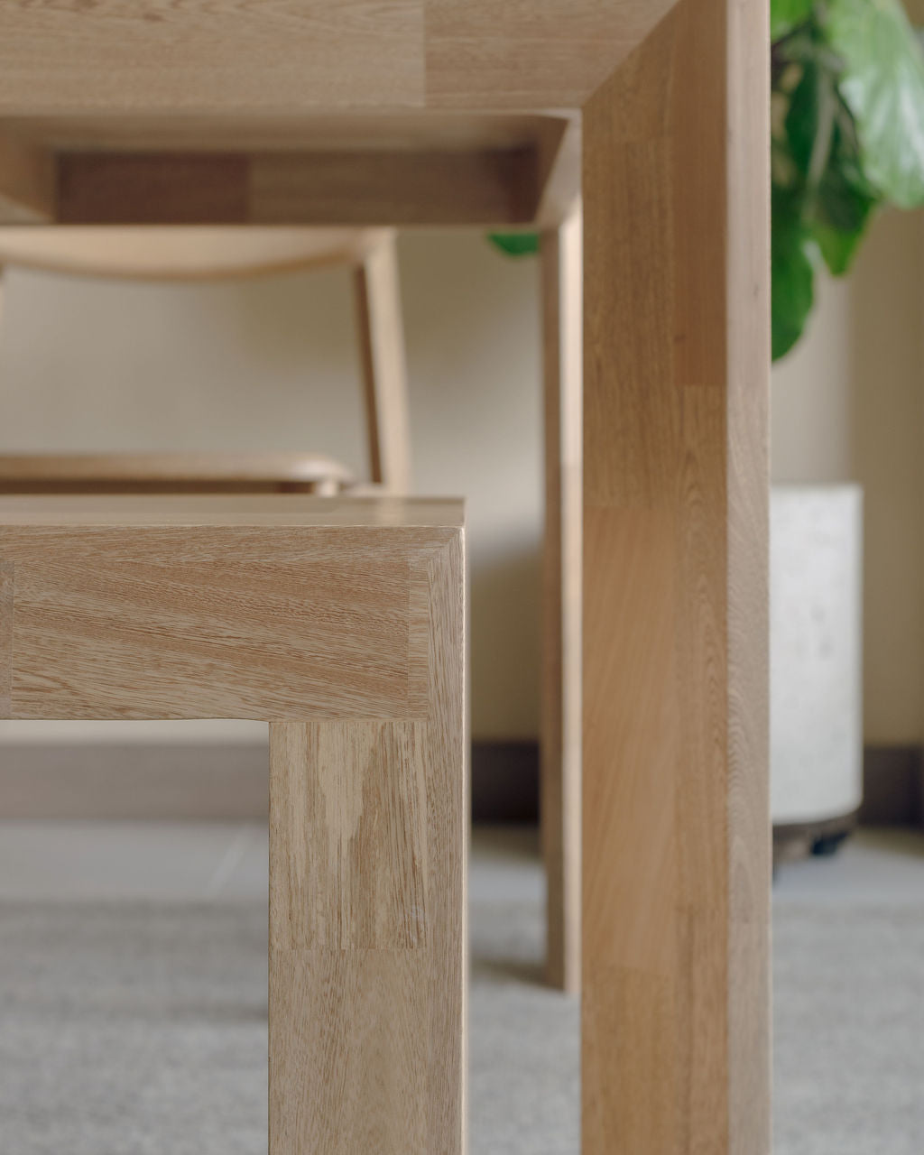 La Banca U cuenta con estructura en roble macizo y acabado natural que resalta la veta del material y la hace adecuada para uso en interiores.
