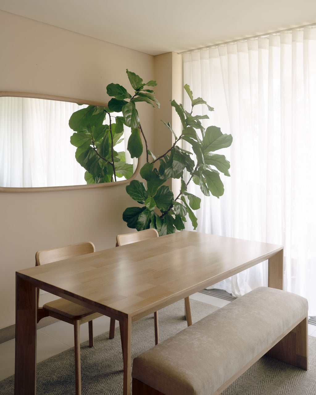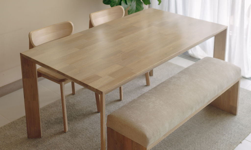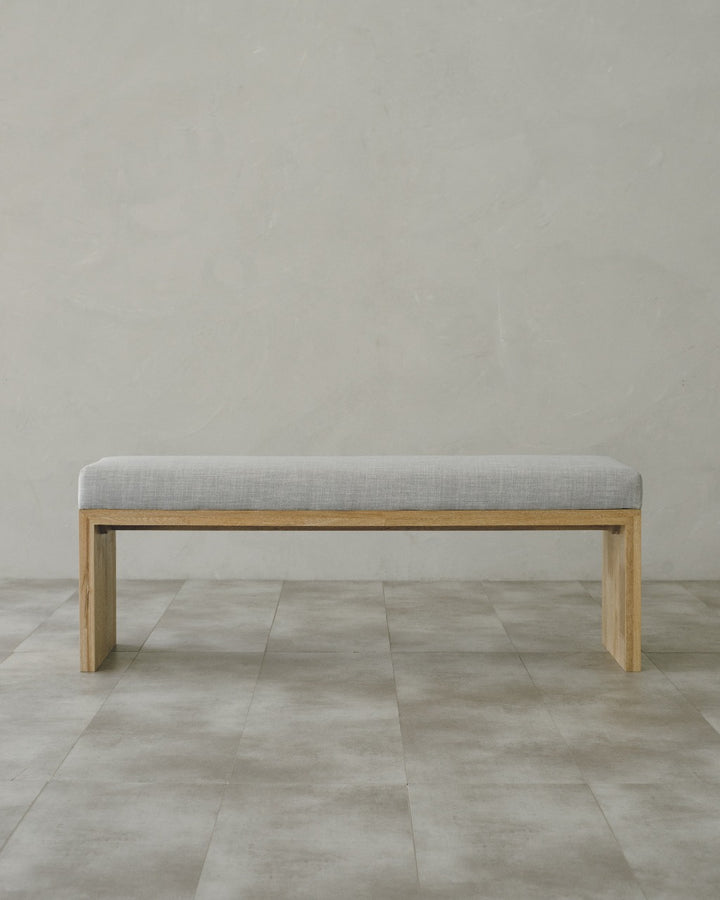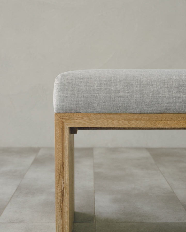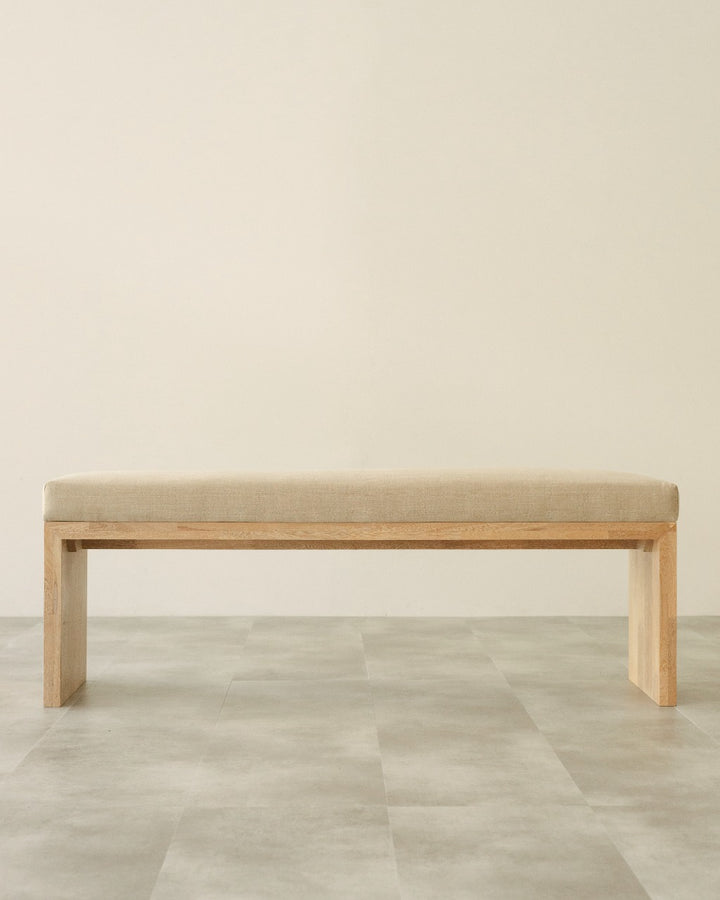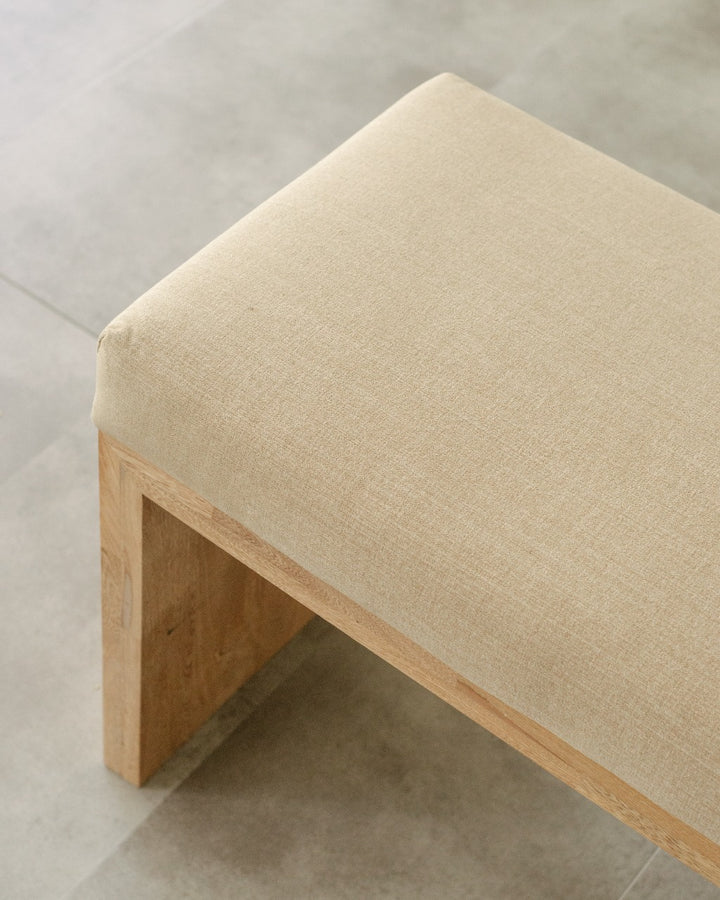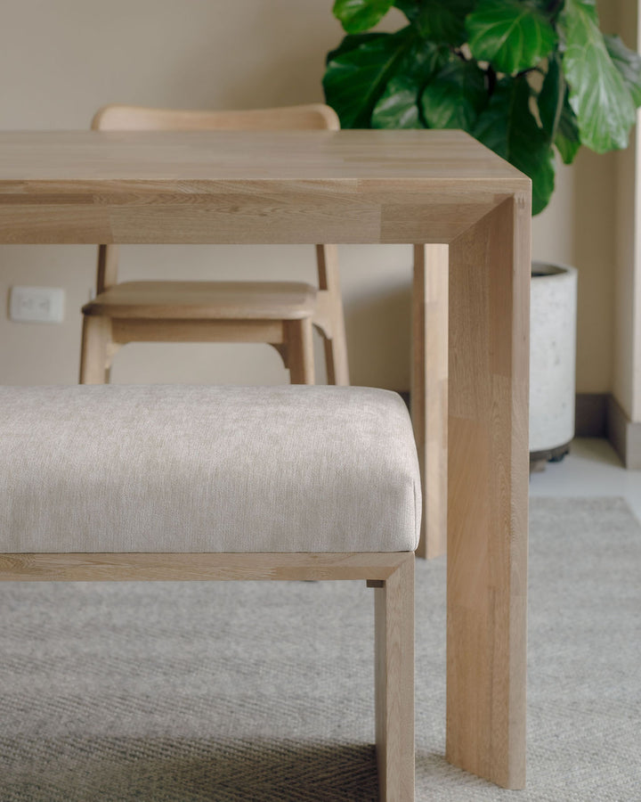 La Banca U cuenta con estructura en roble macizo, acabado natural que resalta la veta del material y asiento tapizado en tela, permitiendo mayor comodidad, lo que la hace adecuada para uso en interiores.