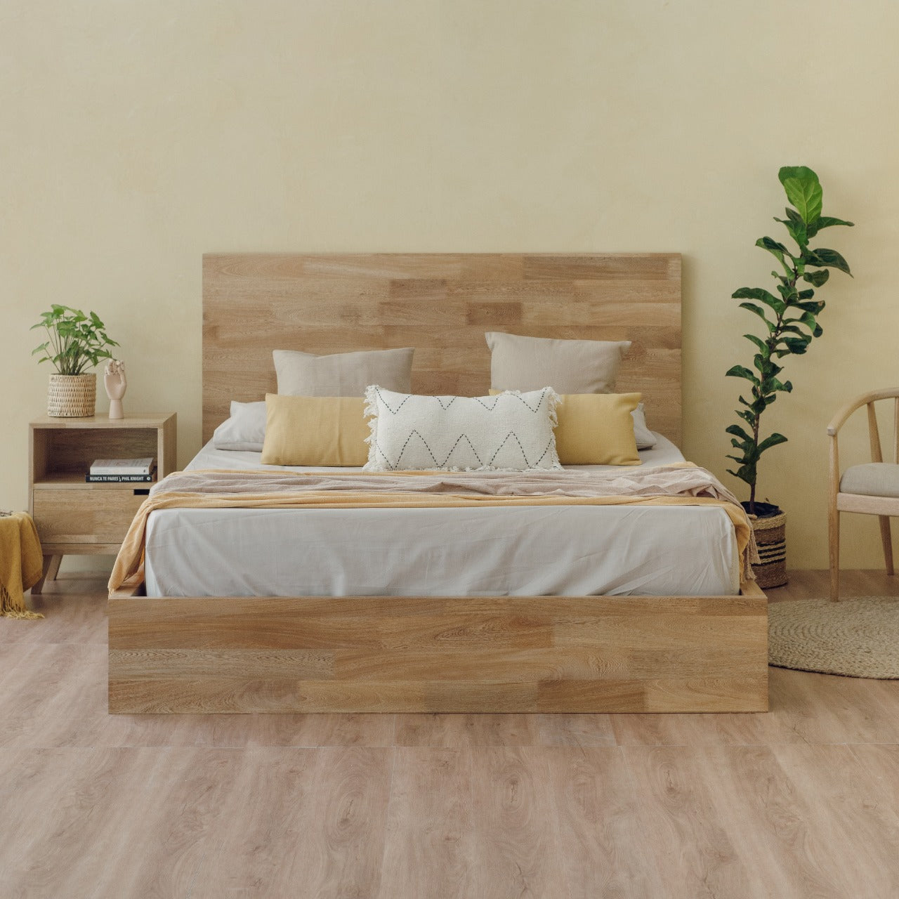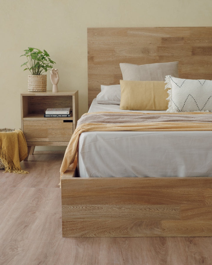 La Cama Tienda cuenta con estructura en madera de roble macizo con acabado natural que resalta la veta del material, cabecero y estructura que contiene y soporta el colchón. Es una cama adecuada para uso en interiores.