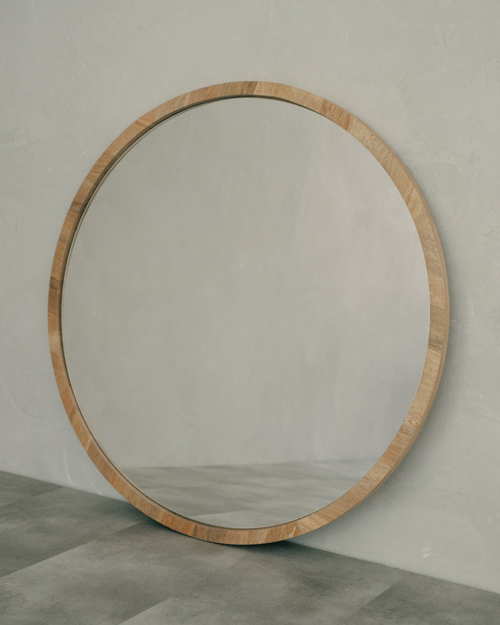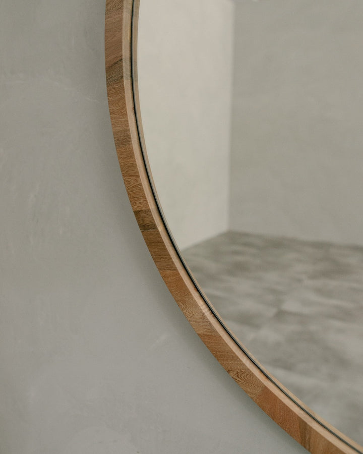 Espejo circular con marco en roble alistonado de 3cm de ancho.