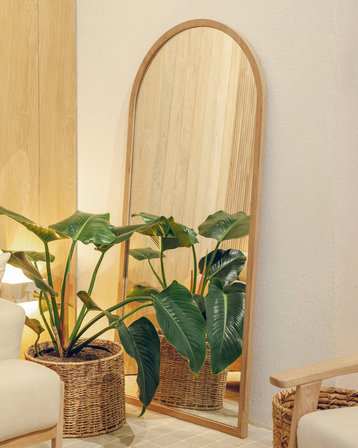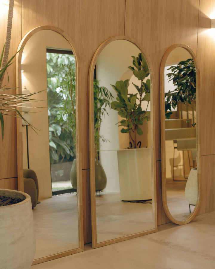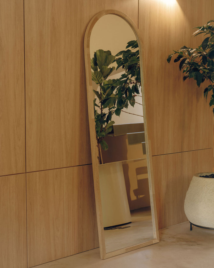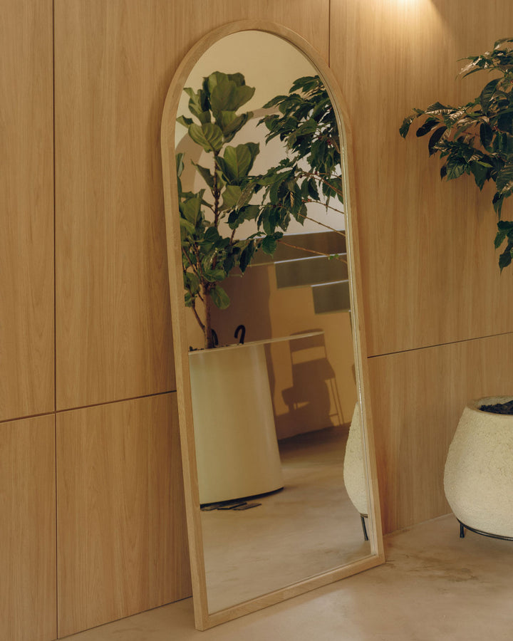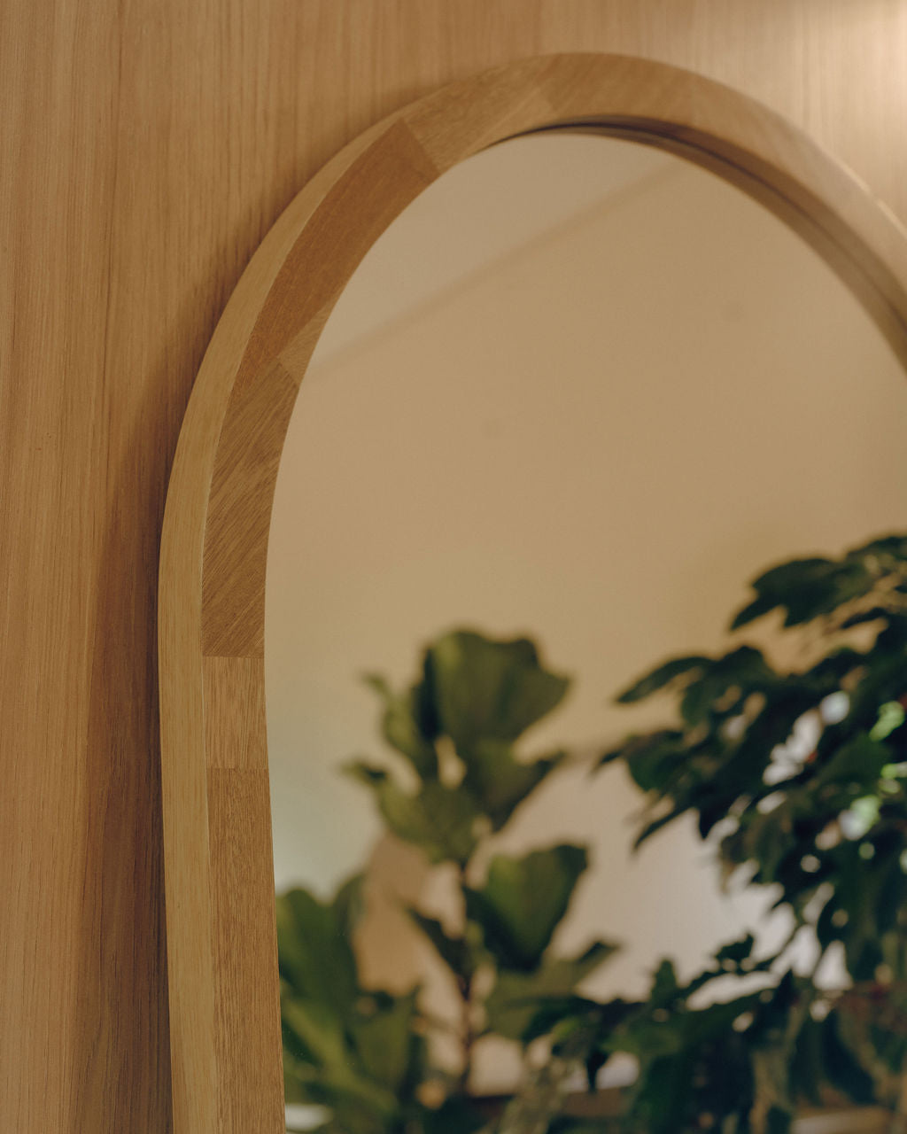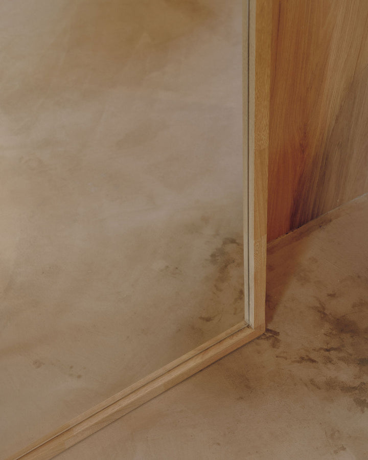 El Espejo Terrah cuenta con marco en madera de roble macizo con acabado natural que resalta la veta del material. Es un espejo adecuado para uso en interiores.
