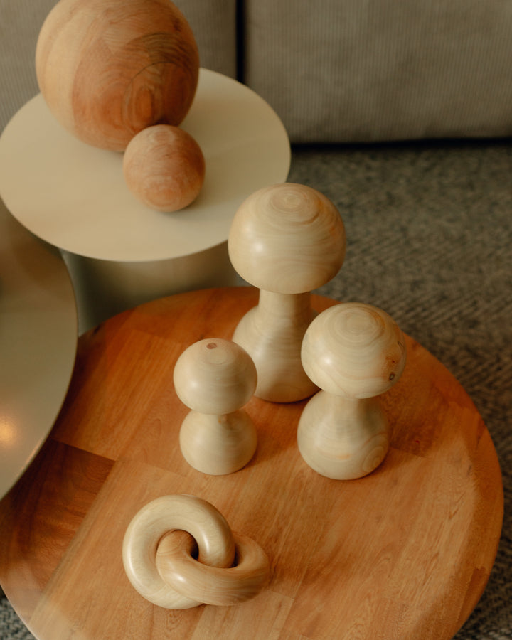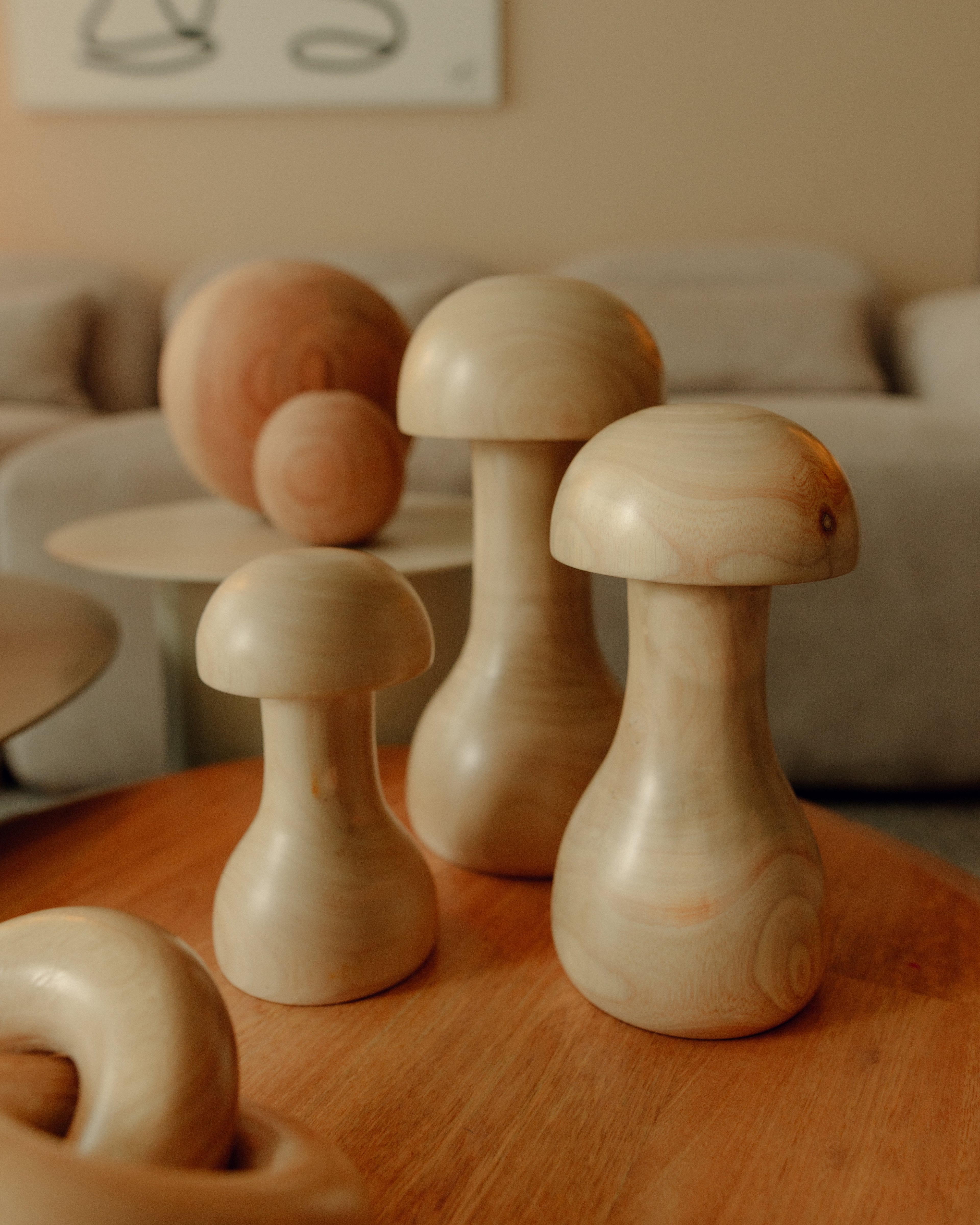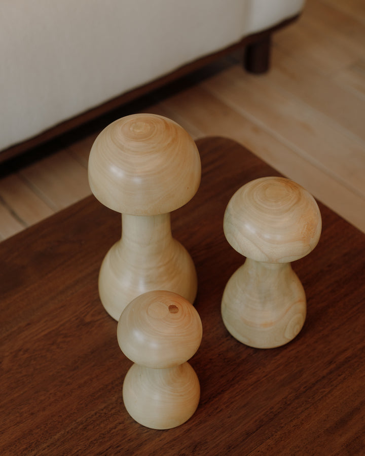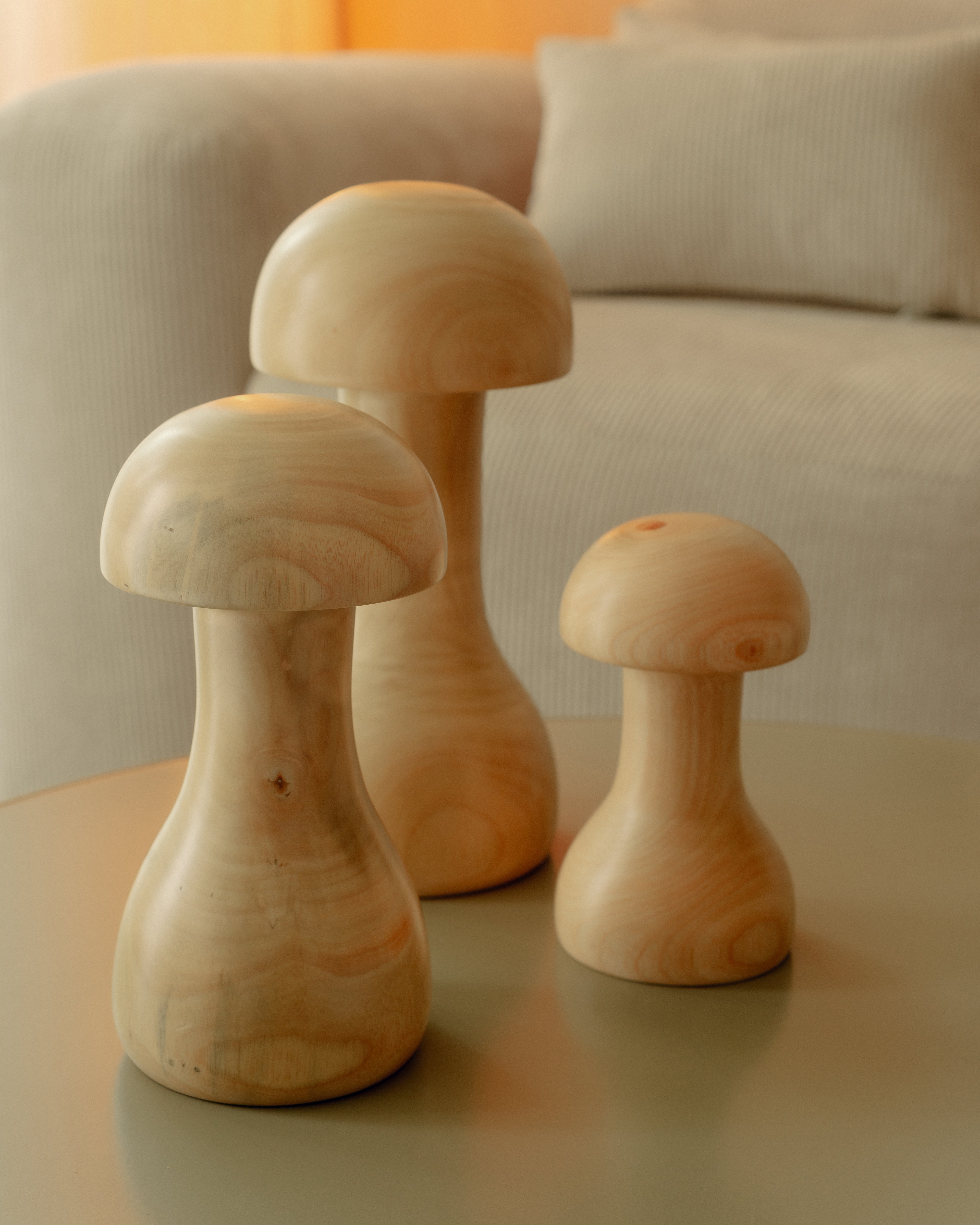 Hongo está construido en madera Urapán con acabado natural que resalta la veta del material. Es un producto elaborado a través de oficios artesanales; por tanto, cada pieza es única y las irregularidades son propias del proceso y del material. Es un complemento adecuado para uso en interiores.
