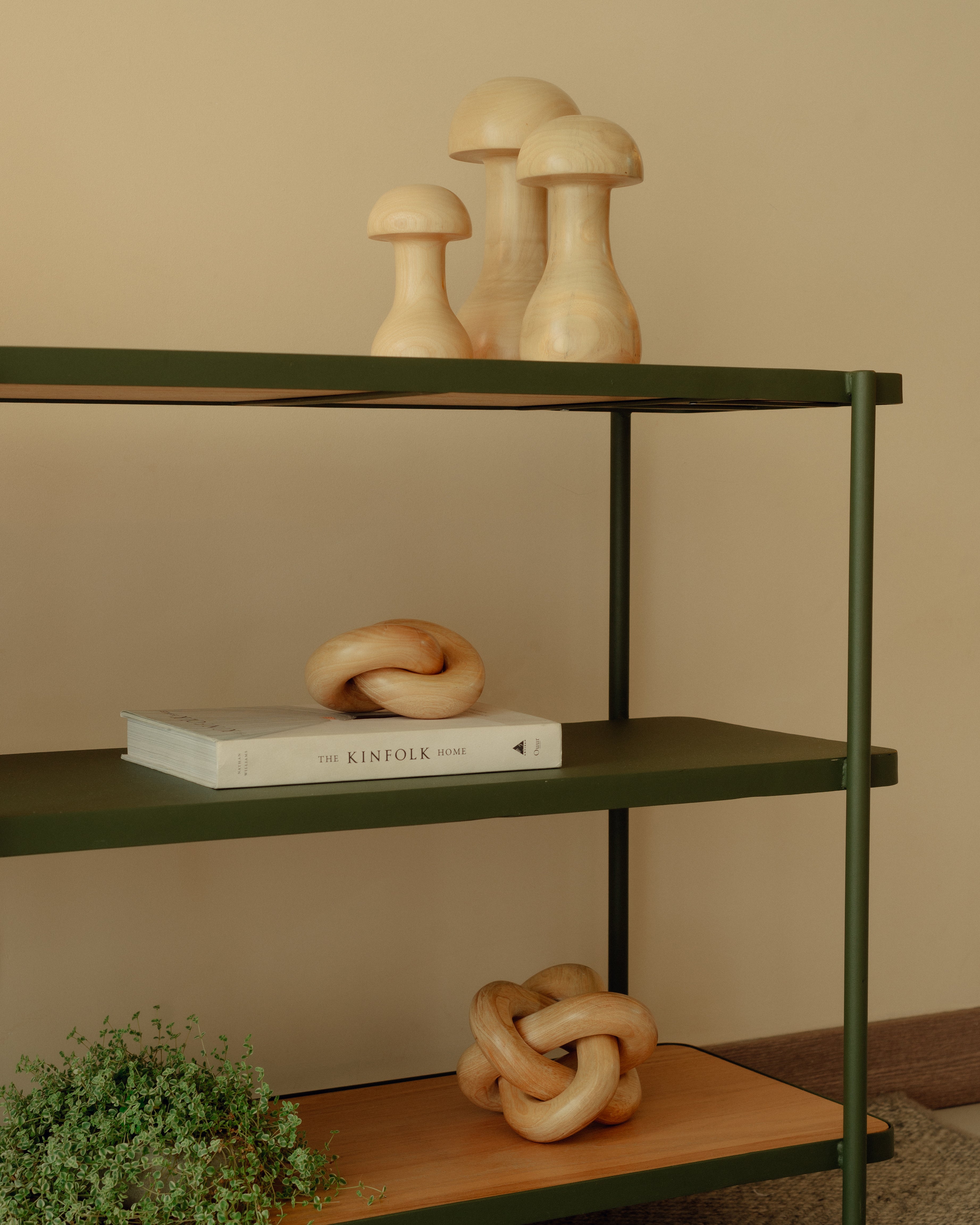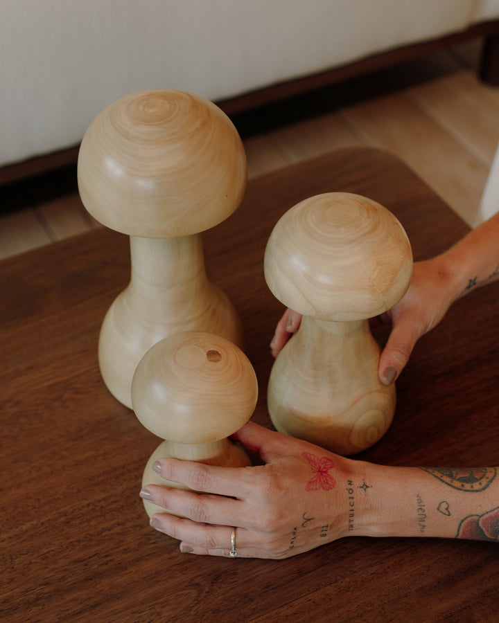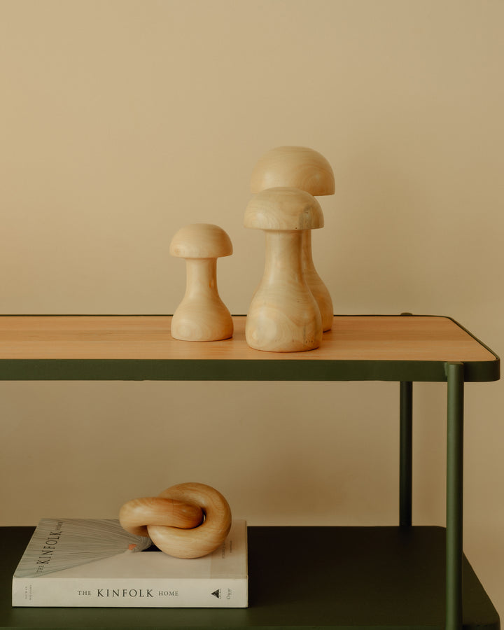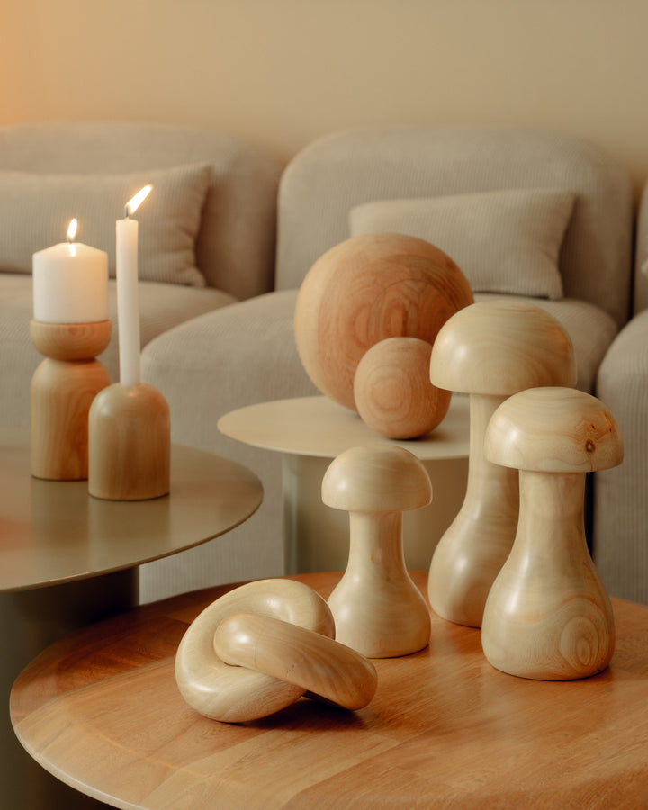 Hongo está construido en madera Urapán con acabado natural que resalta la veta del material. Es un producto elaborado a través de oficios artesanales; por tanto, cada pieza es única y las irregularidades son propias del proceso y del material. Es un complemento adecuado para uso en interiores.