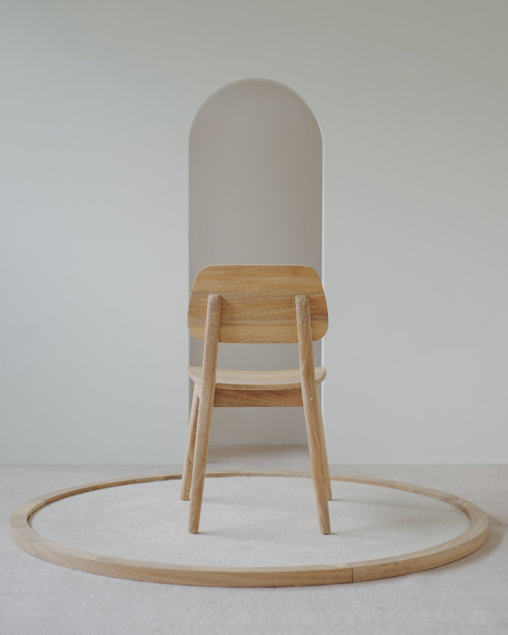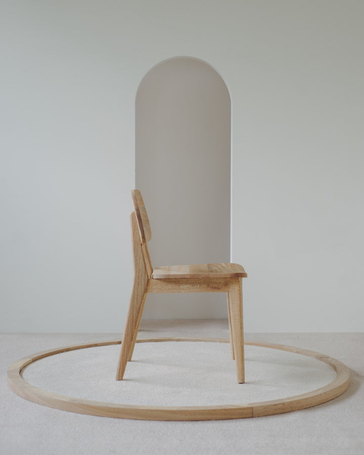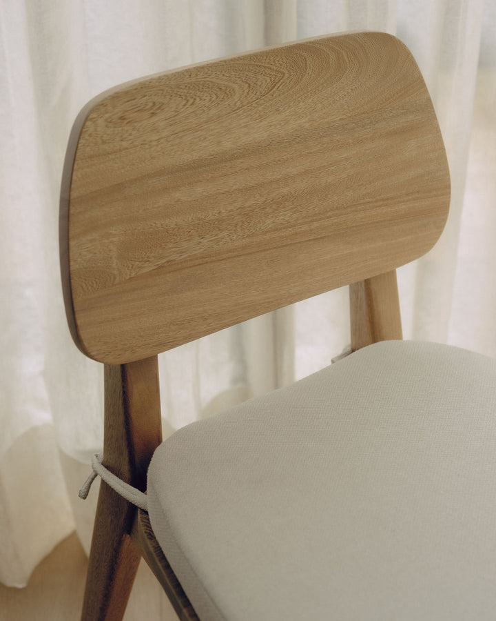 La Silla Vela cuenta con estructura, asiento y espaldar en madera de roble macizo, con acabado natural que resalta la veta del material y la hace adecuada para uso en interiores.