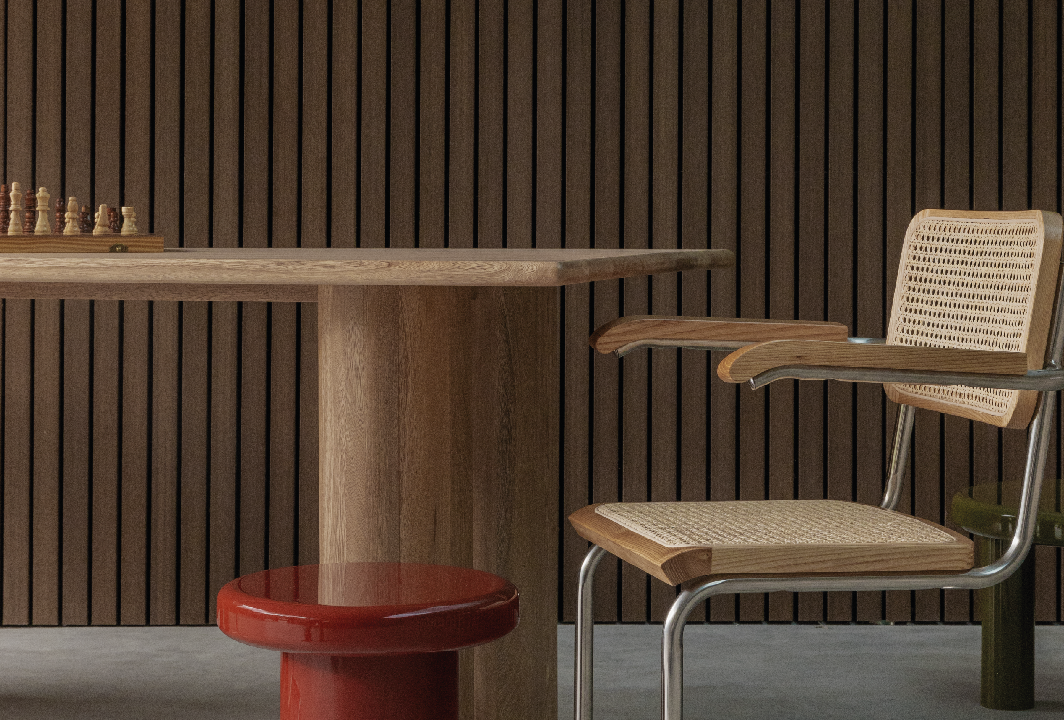 Su diseño se inspira en las formas orgánicas de los años 70 y se caracteriza por el contraste entre sus patas robustas redondeadas con su superficie alargada y lineal. Es una mesa atemporal que aporta identidad a cualquier espacio y funciona como una pieza versátil, ideal para ambientes contemporáneos.