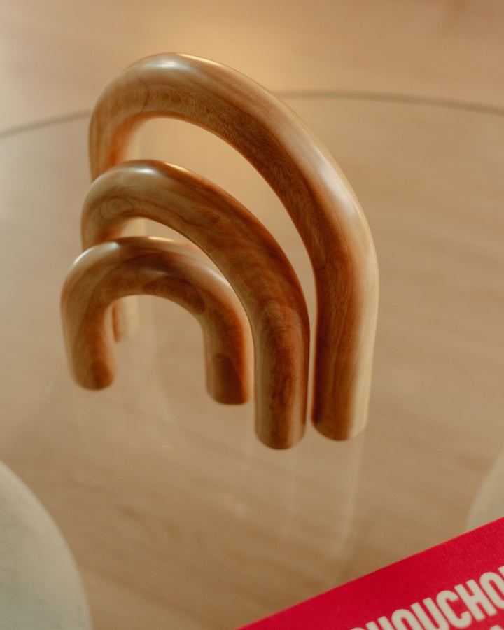 Vong es una serie de aros construidos en madera Urapán con acabado natural que resalta la veta del material. Es un producto elaborado a través de oficios artesanales; por tanto, cada pieza es única y las irregularidades son propias del proceso y del material. Es un complemento adecuado para uso en interiores.