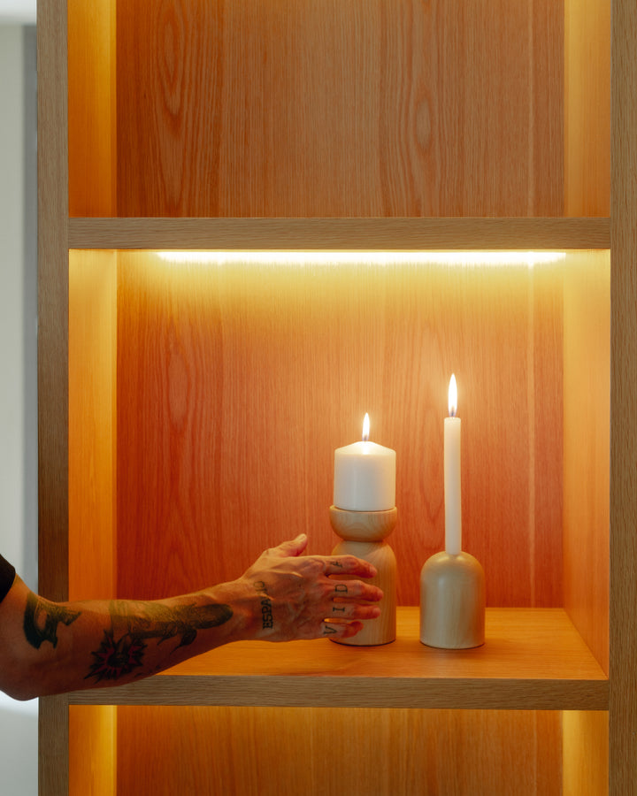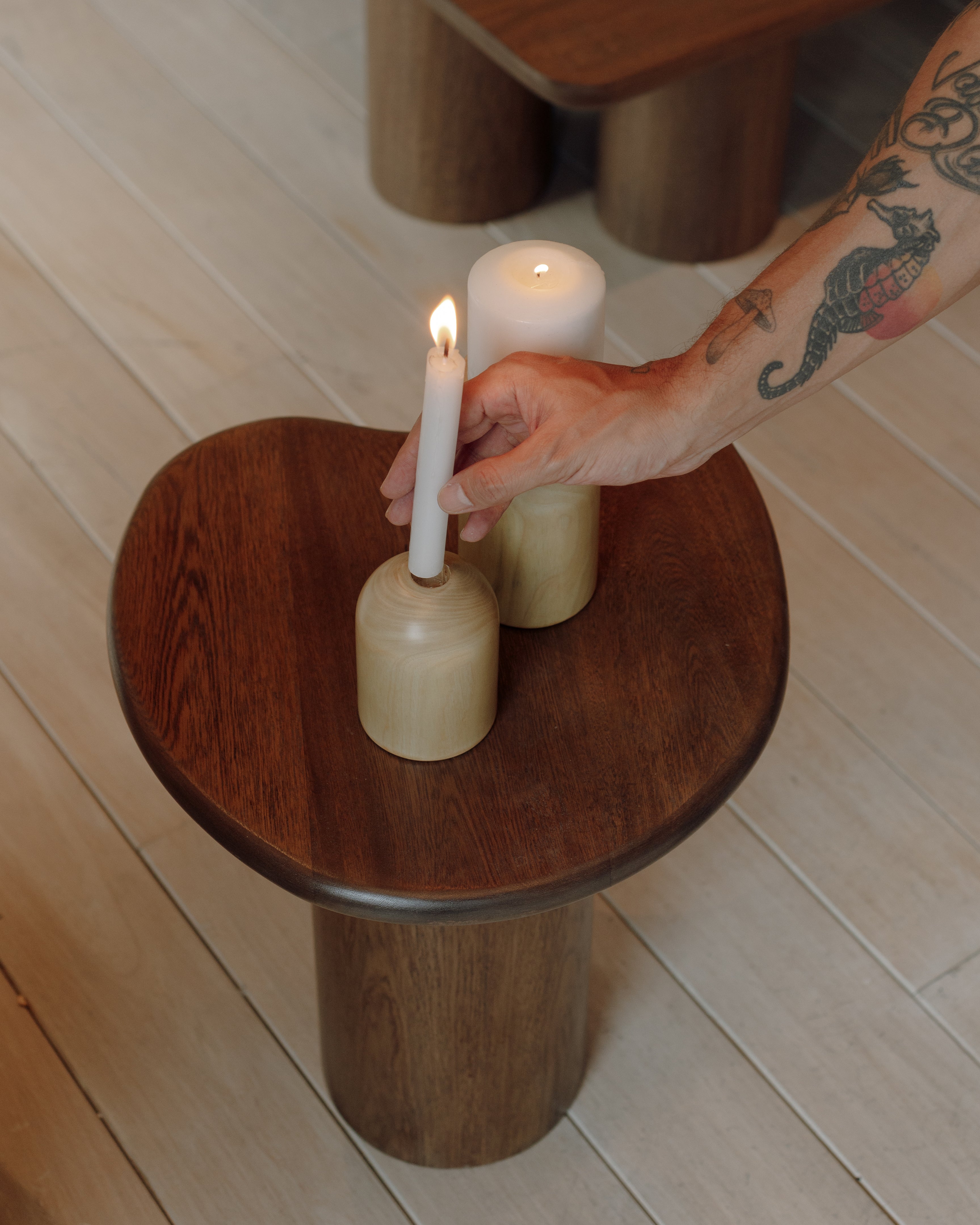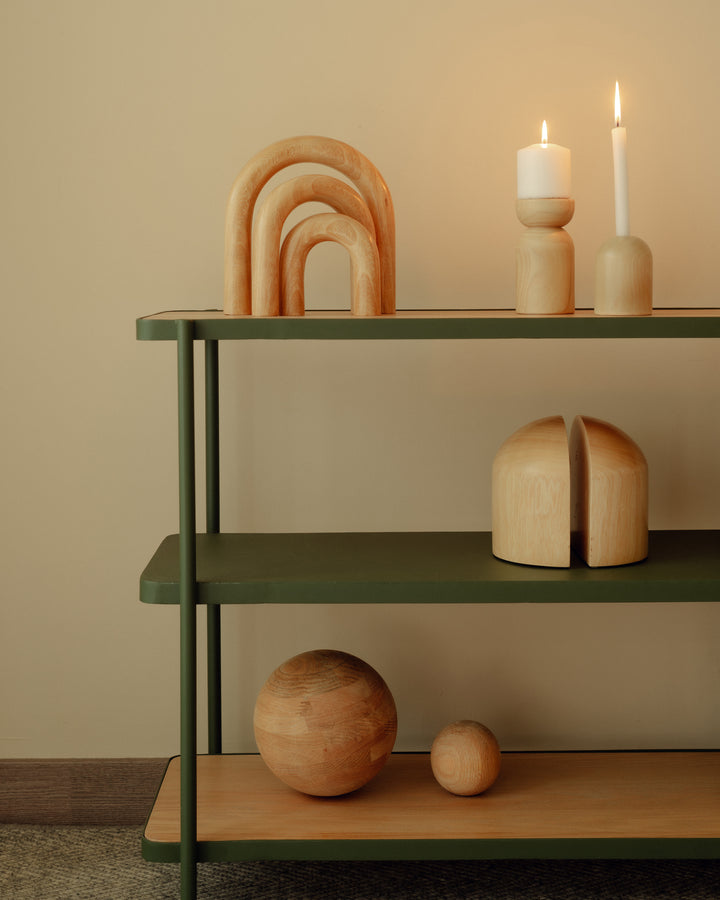Se caracteriza por formas circulares macizas y robustas. Aporta calidez al espacio y es adecuado como pieza central en mesas o eventos especiales. Su estilo lo convierte en una pieza adecuada para crear ambientes con identidad.