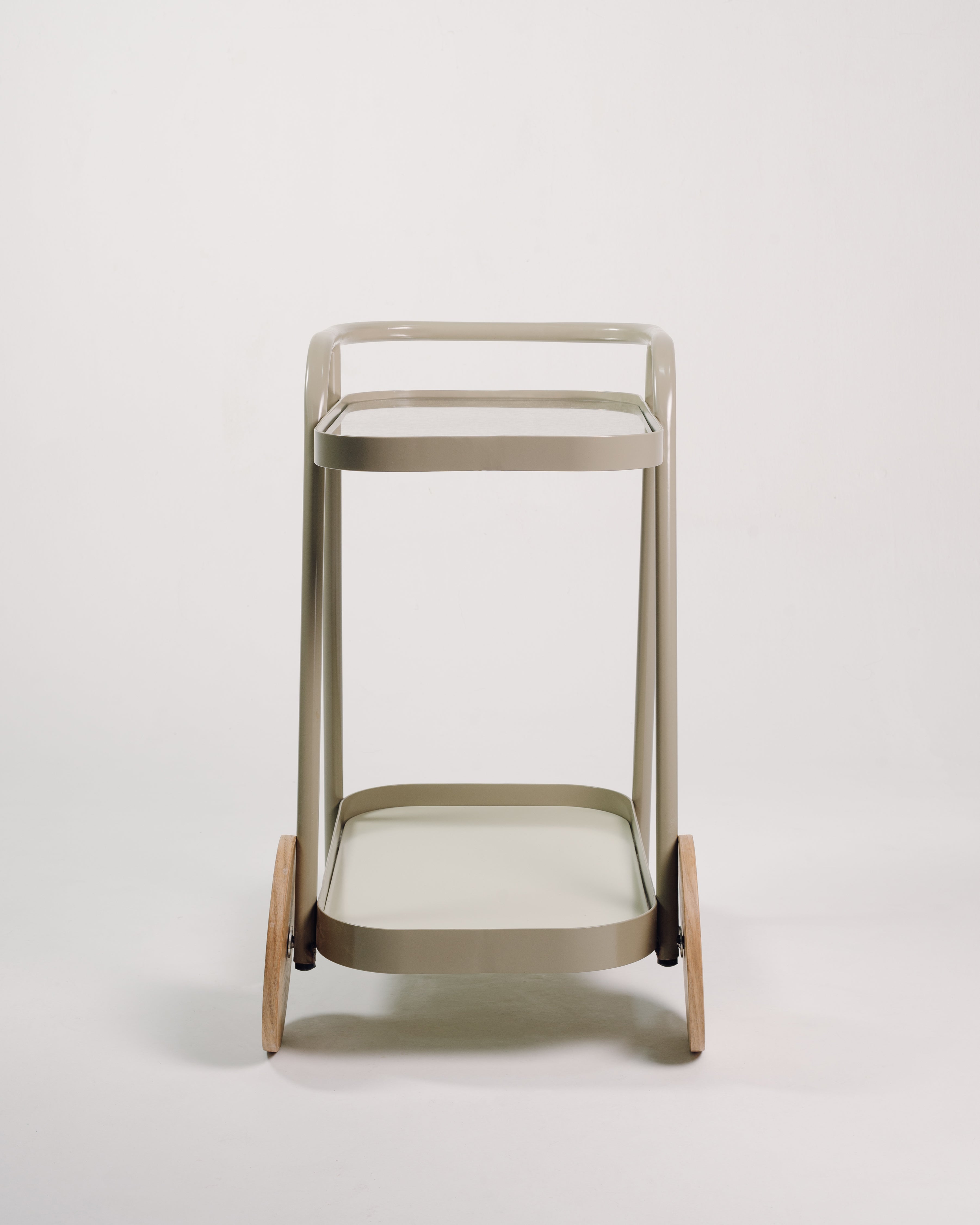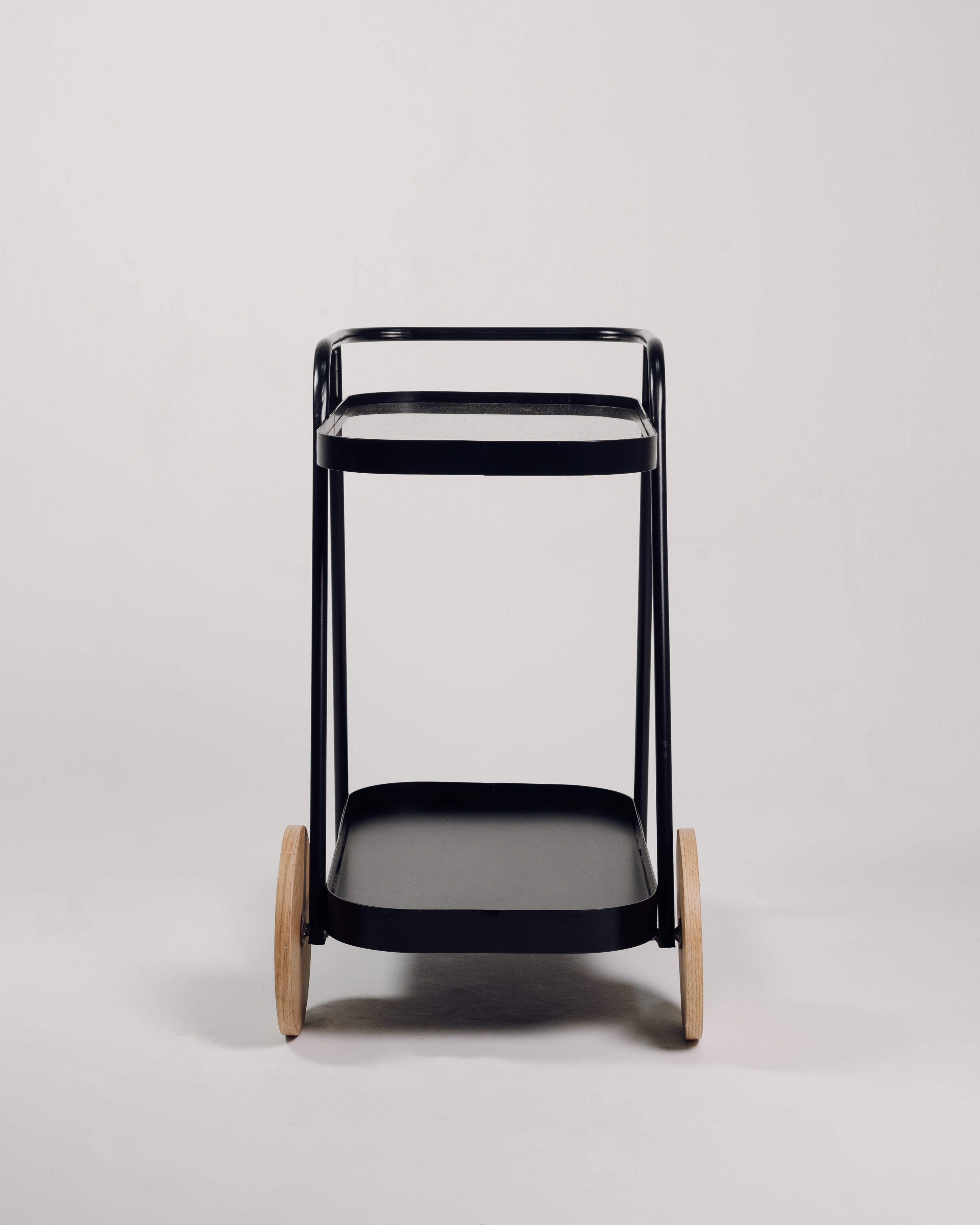 El Carro Bar cuenta con estructura en metal recubierta con pintura electrostática, superficie superior en vidrio con apariencia envejecida y bases delanteras en madera de roble macizo con acabado natural que resalta la veta del material. Es un Carro Bar adecuado para uso en interiores.