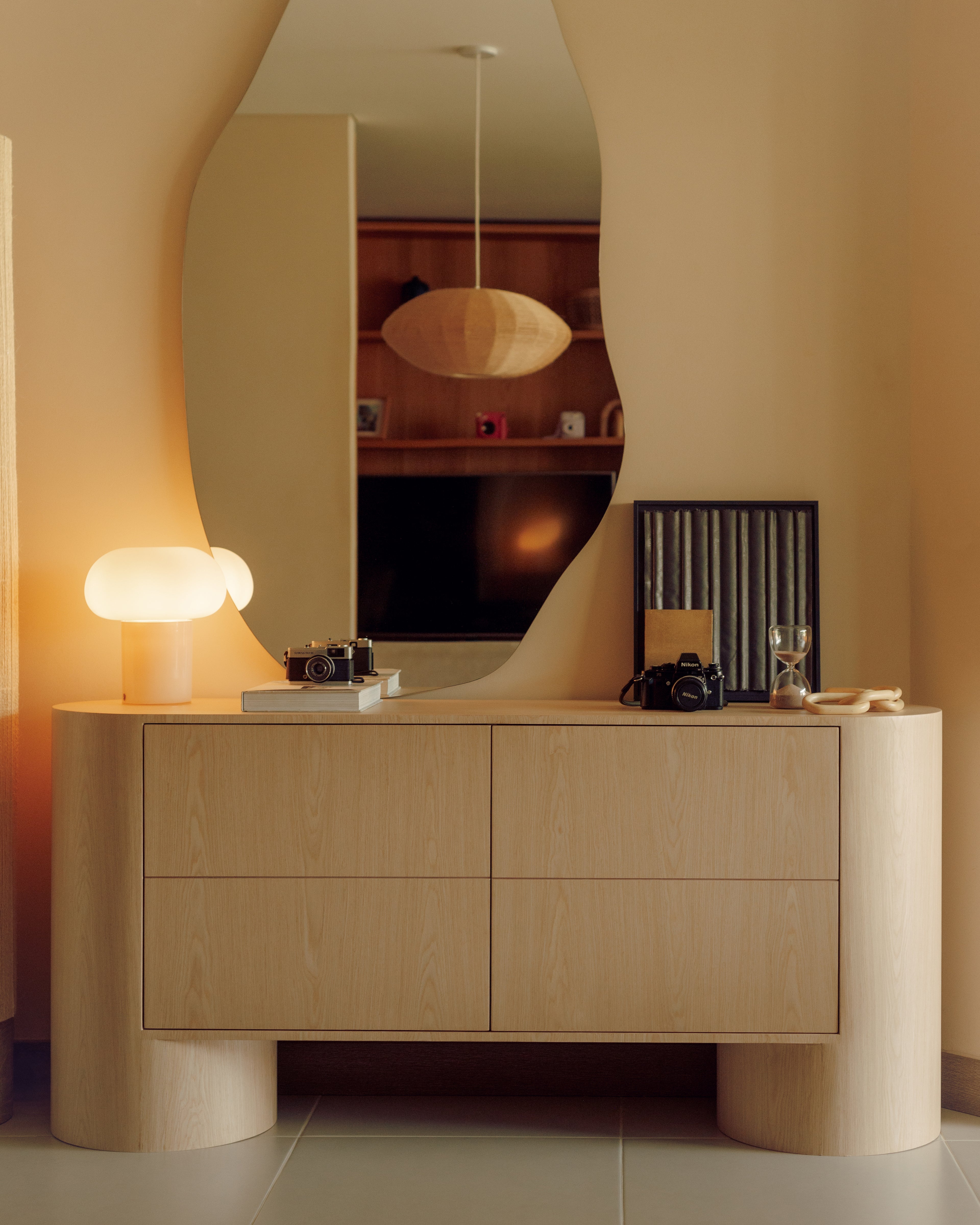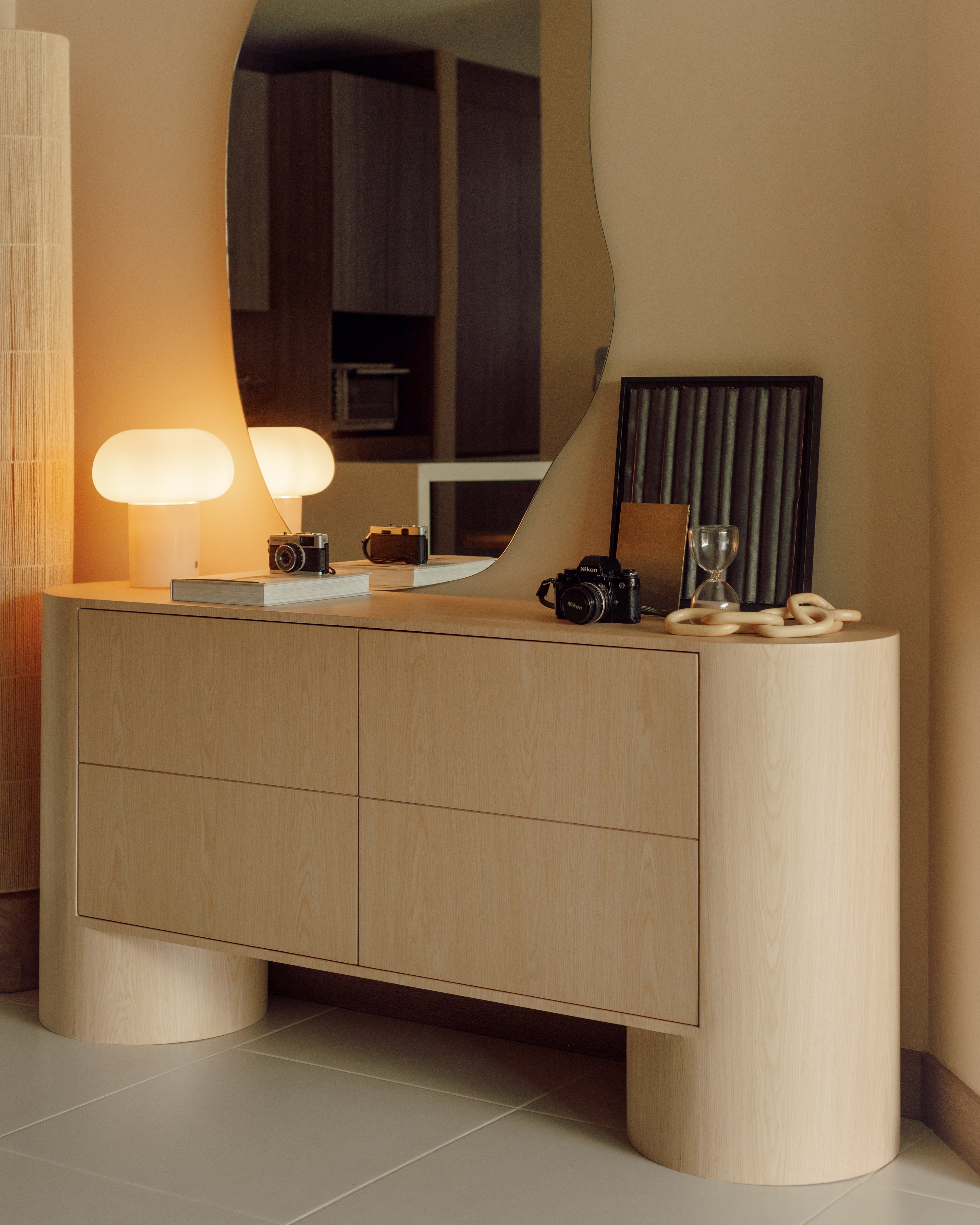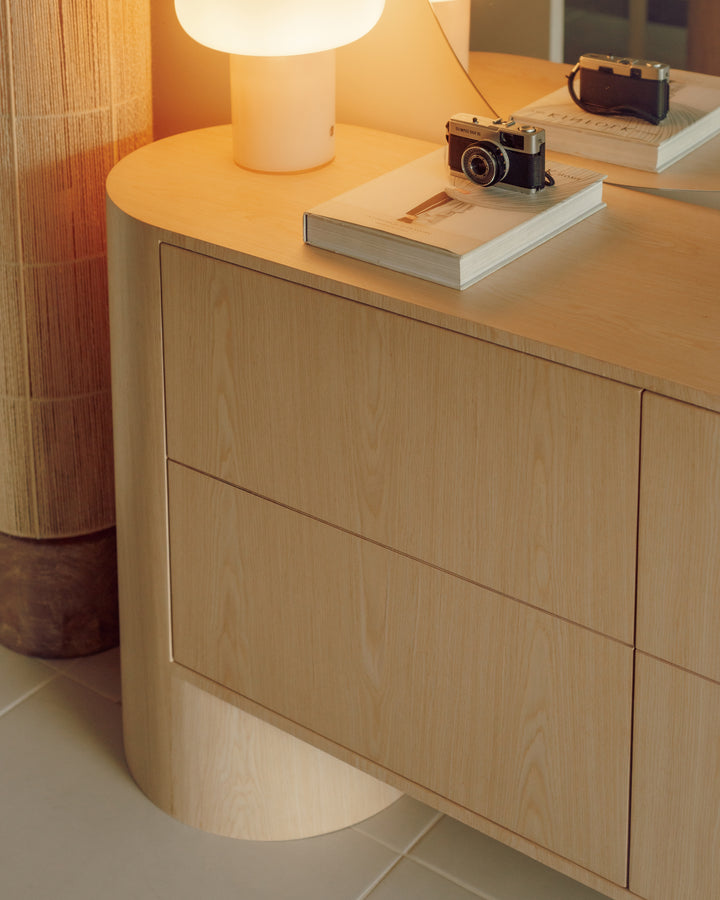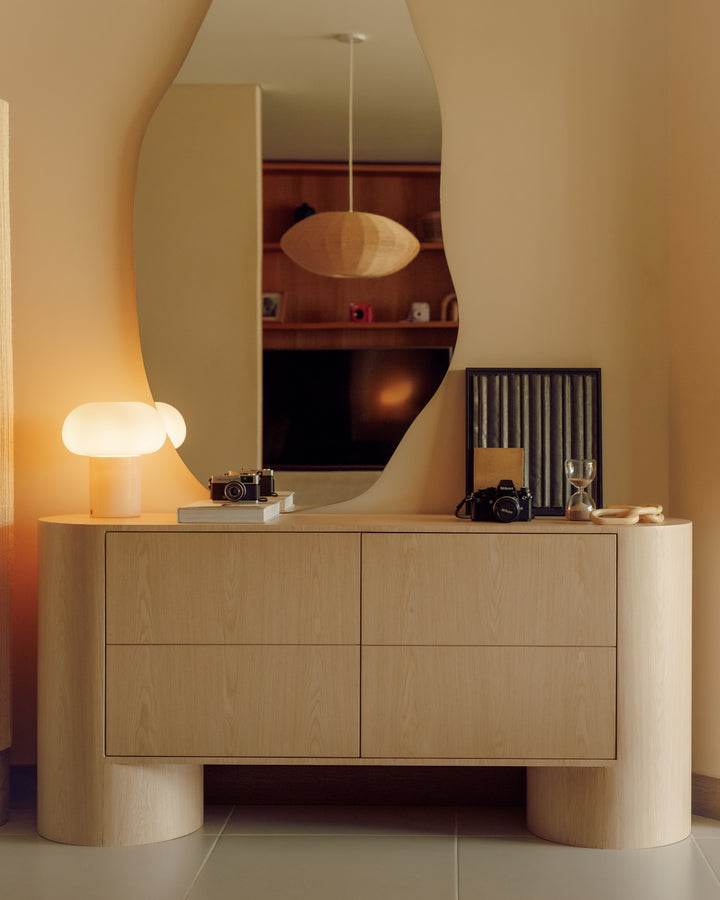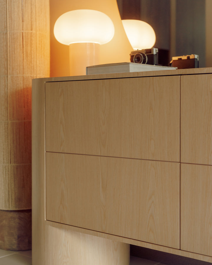 Su diseño se caracteriza por geometrías curvas y robustas, con bordes suaves que aportan ligereza visual y continuidad. Bahía es una pieza expresiva y dominante. Su estilo la convierte en una pieza adecuada para cualquier espacio.