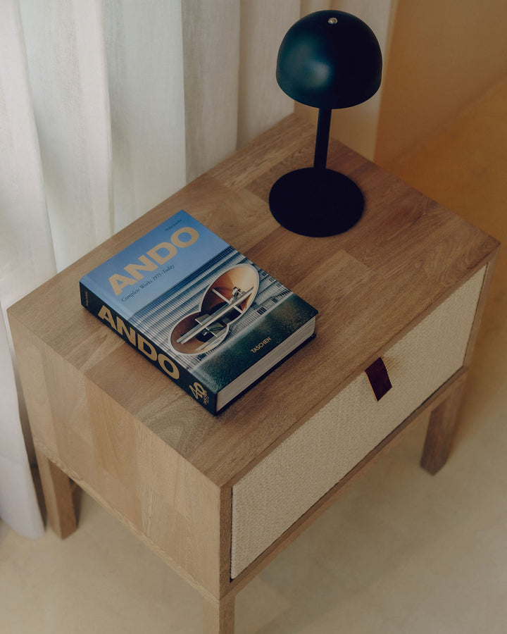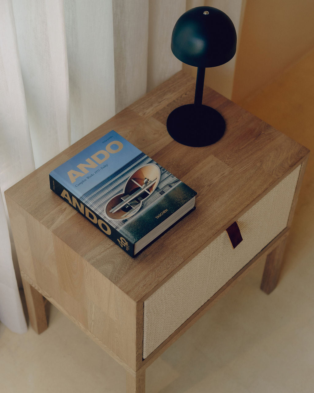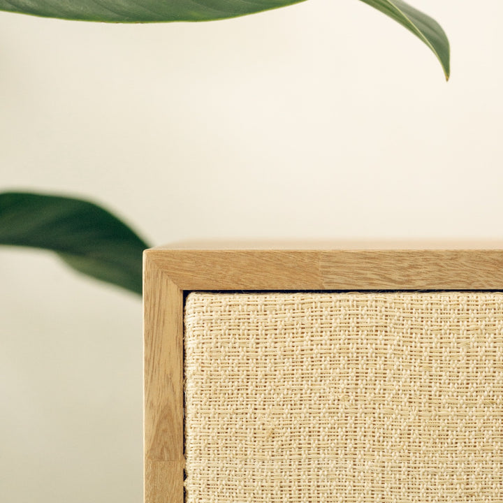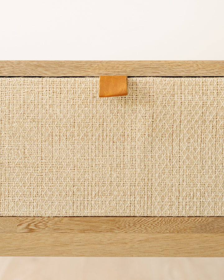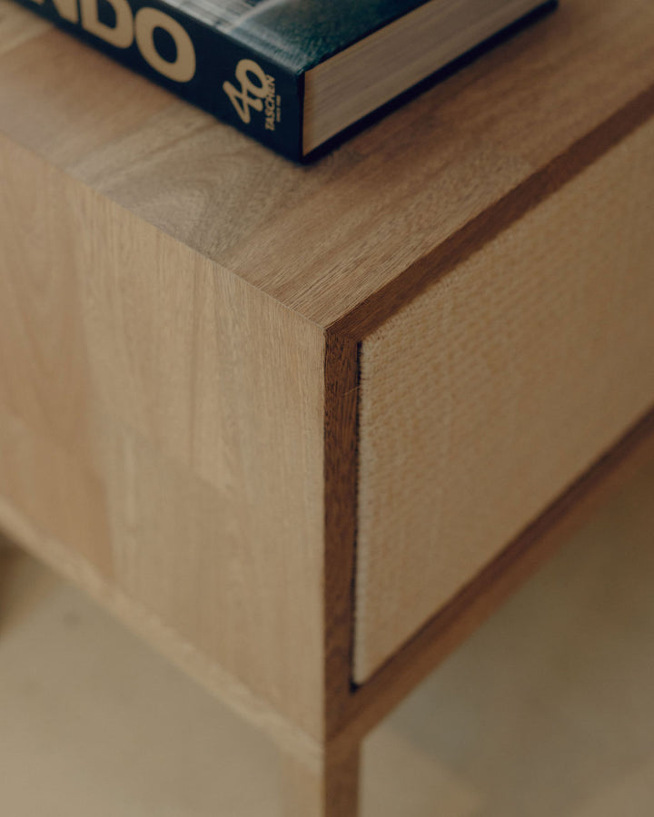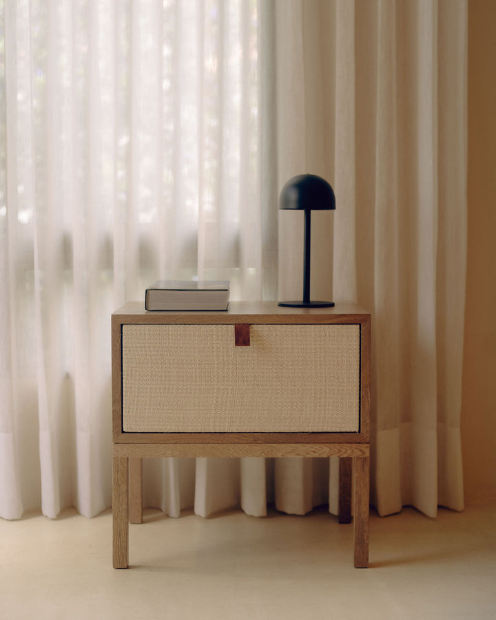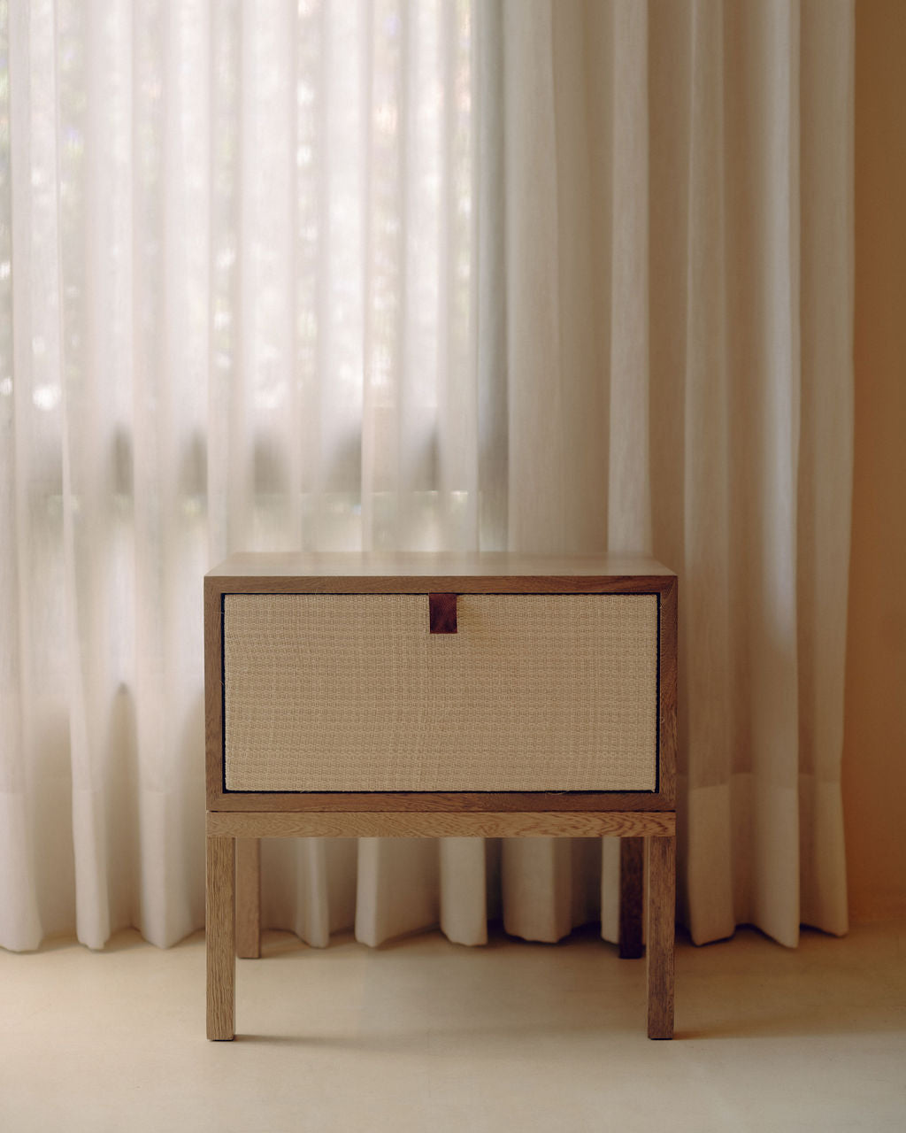 La Mesa de Noche Alena cuenta con estructura en madera de roble macizo (alistonado) con acabado natural que resalta la veta del material, cajón interno con cara frontal tejida en fique y sistema de apertura mediante rieles. Es una mesa de noche adecuada para uso en interiores.