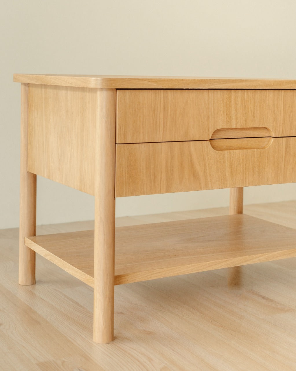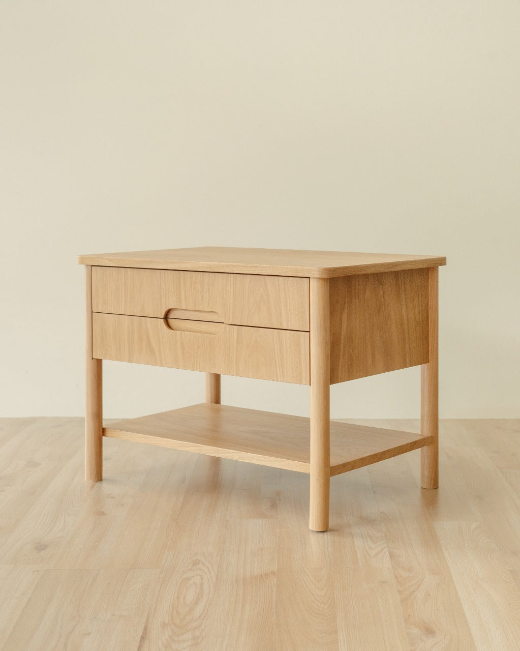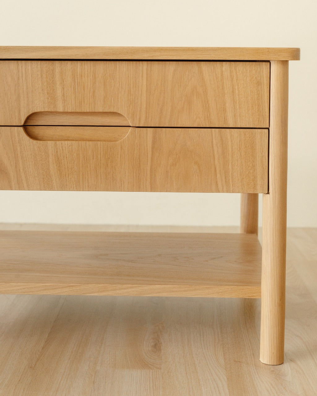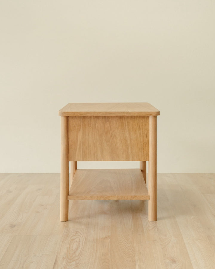 La Mesa de Noche Lino cuenta con estructura en madera revestida en chapilla de roble, patas en roble macizo con acabado natural que resalta la veta del material y cajón interno con sistema de apertura mediante rieles. Es una mesa de noche adecuada para uso en interiores.
