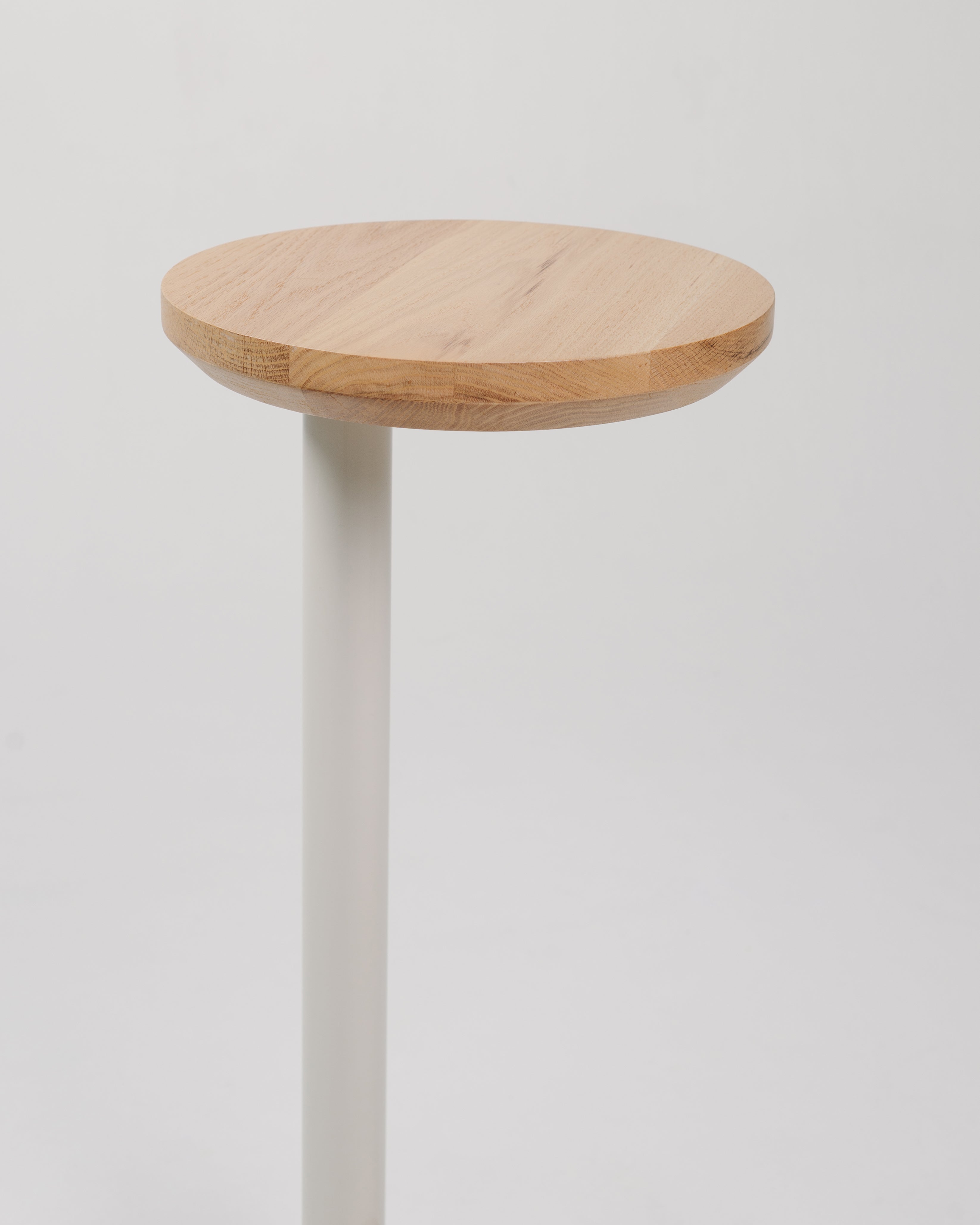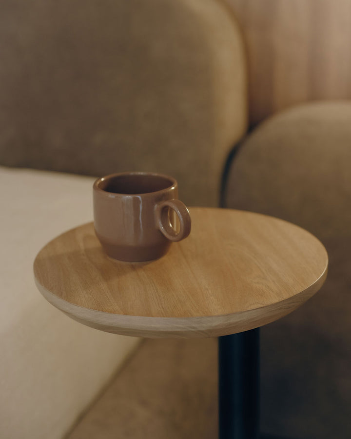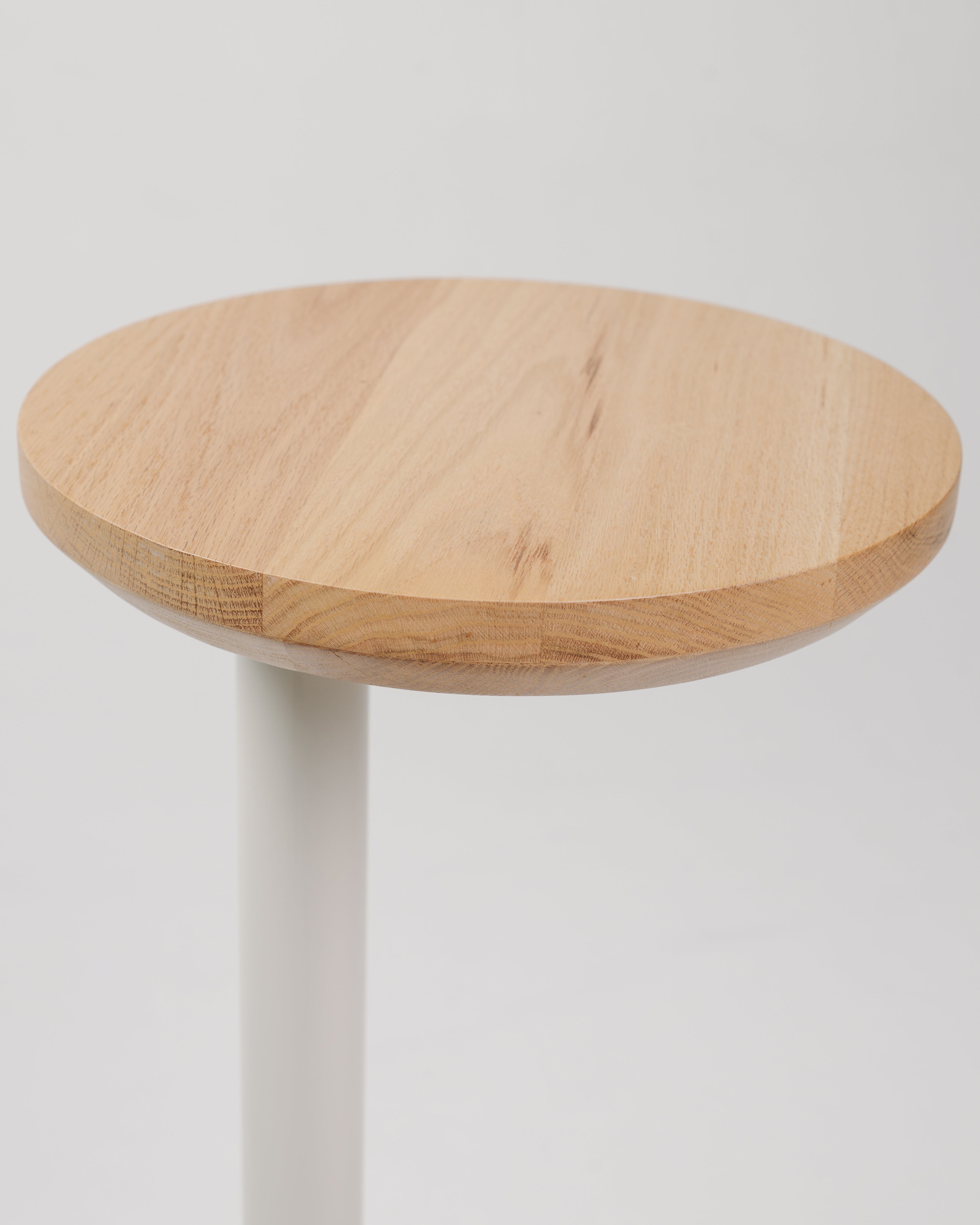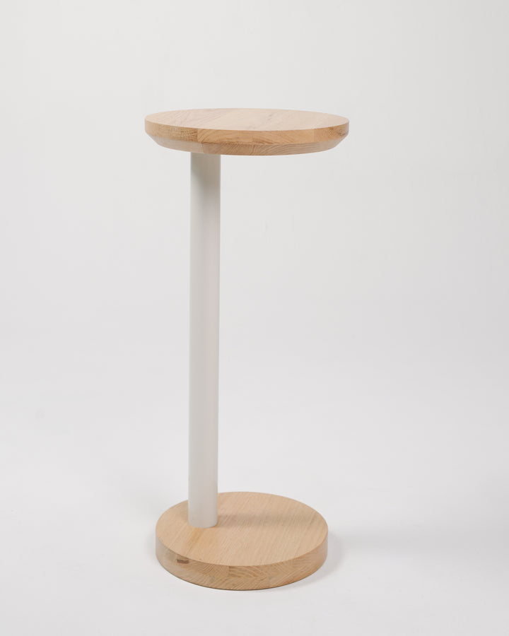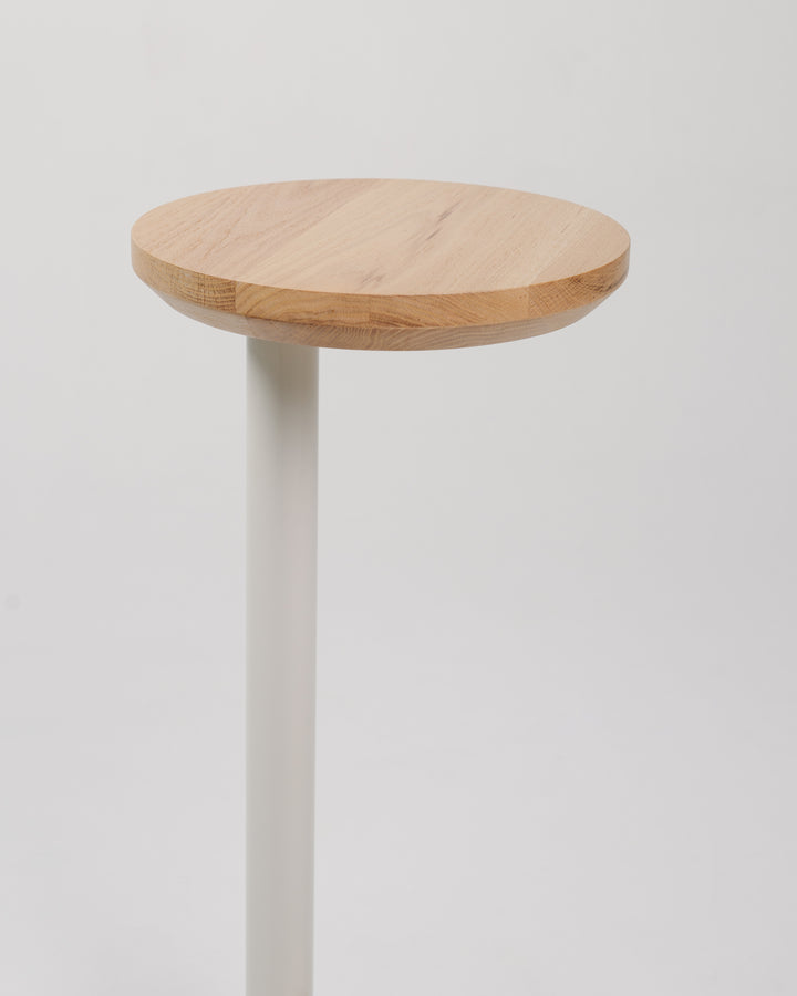 La Mesa Auxiliar Circle cuenta con estructura metálica con acabado en pintura electrostática, superficie y base en madera de roble macizo con acabado natural que resalta la veta del material. Es una Mesa Auxiliar adecuada para uso en interiores.
