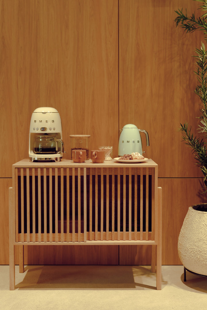 Su diseño se caracteriza por geometrías regulares que aportan ritmo y movimiento visual. Station es una pieza funcional. Su estilo la convierte en una pieza adecuada para crear ambientes cálidos.