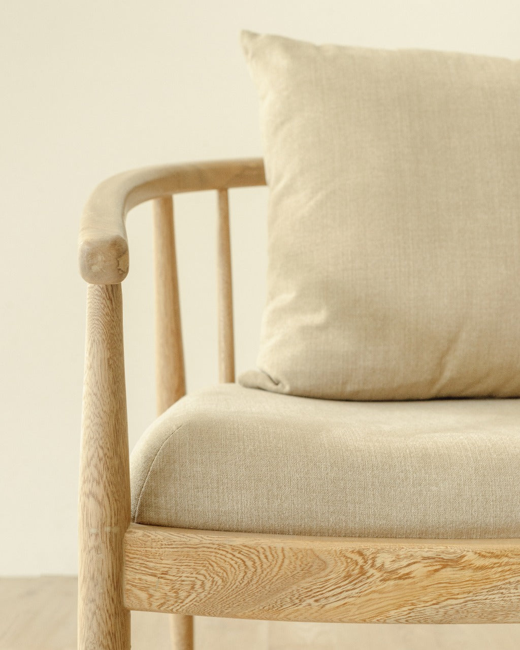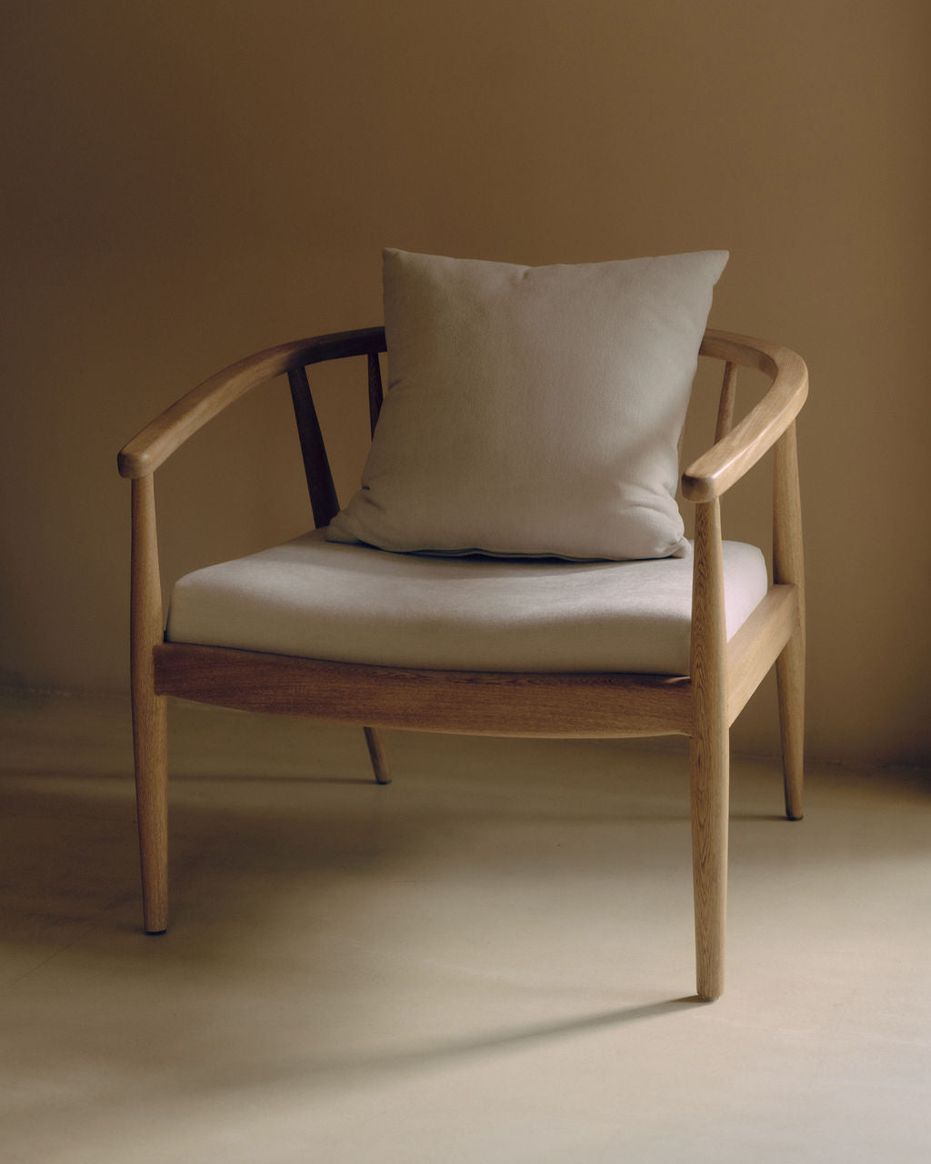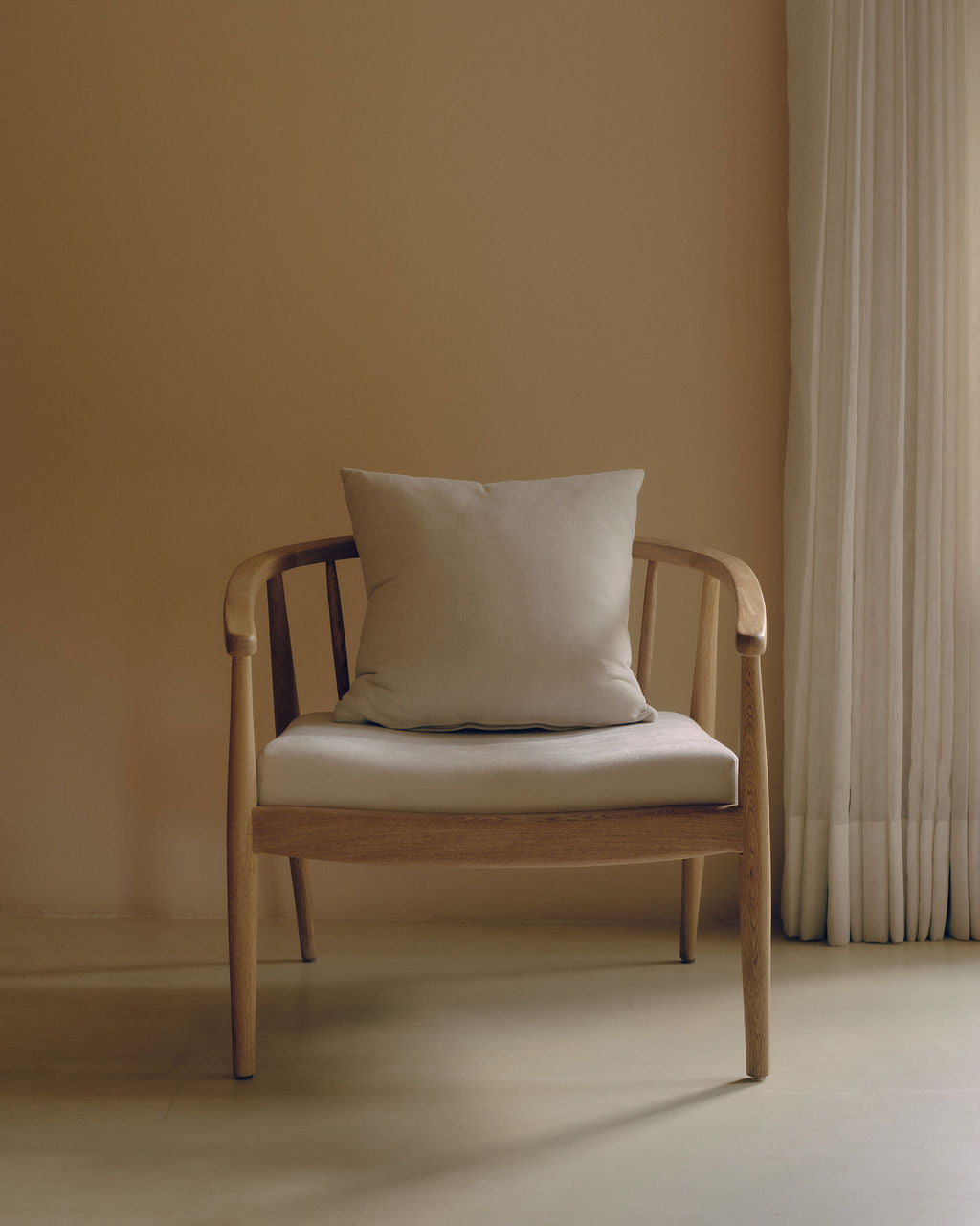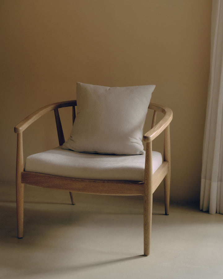La Poltrona Sicilia cuenta con estructura en roble macizo con acabado natural que resalta la veta del material, asiento y espalda (cojín removible) tapizados en tela, lo que la hace adecuada para uso en interiores.