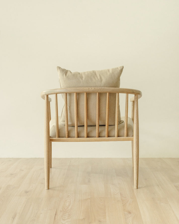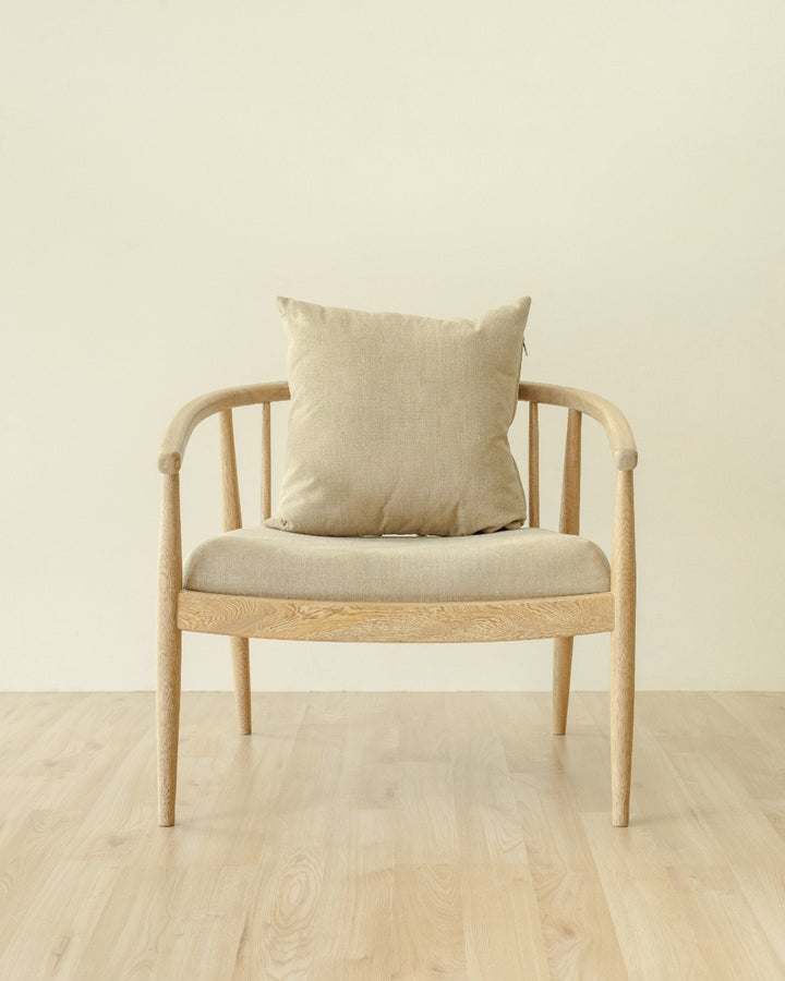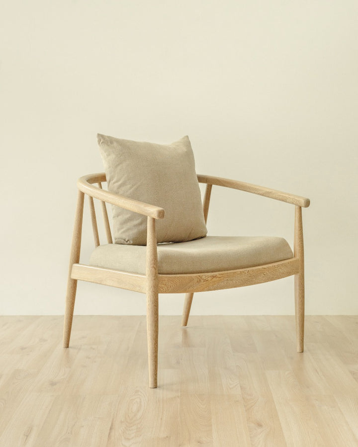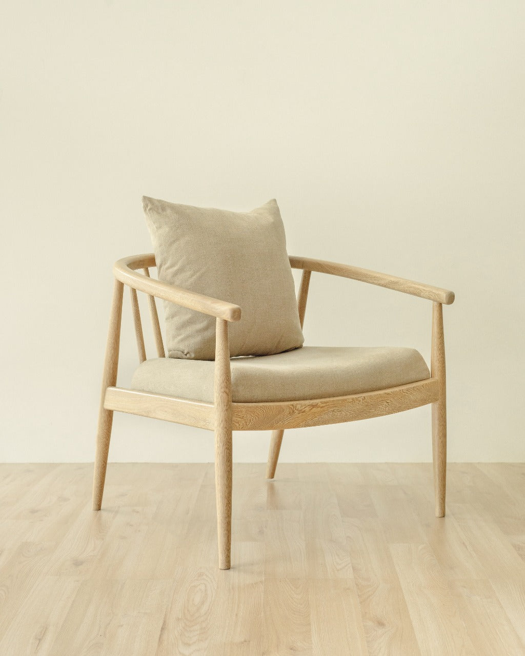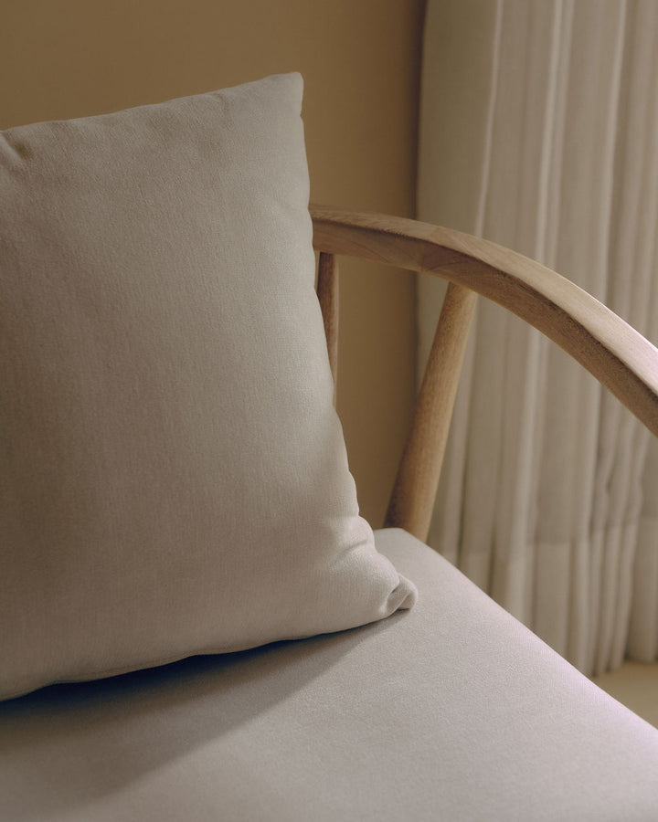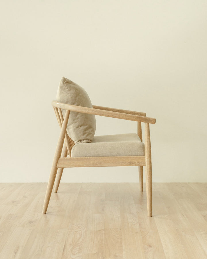 La Poltrona Sicilia cuenta con estructura en roble macizo con acabado natural que resalta la veta del material, asiento y espalda (cojín removible) tapizados en tela, lo que la hace adecuada para uso en interiores.