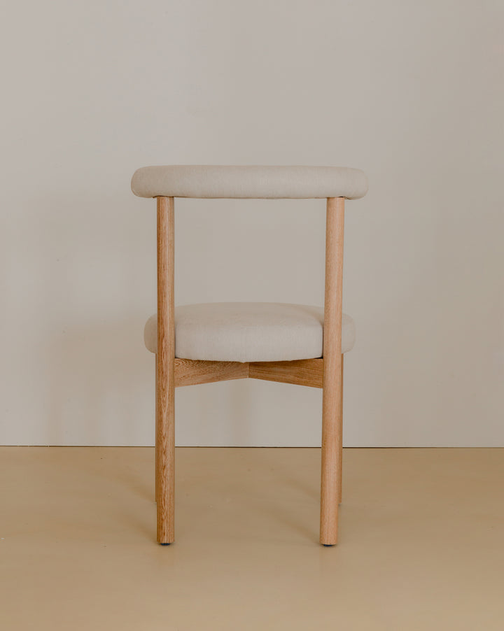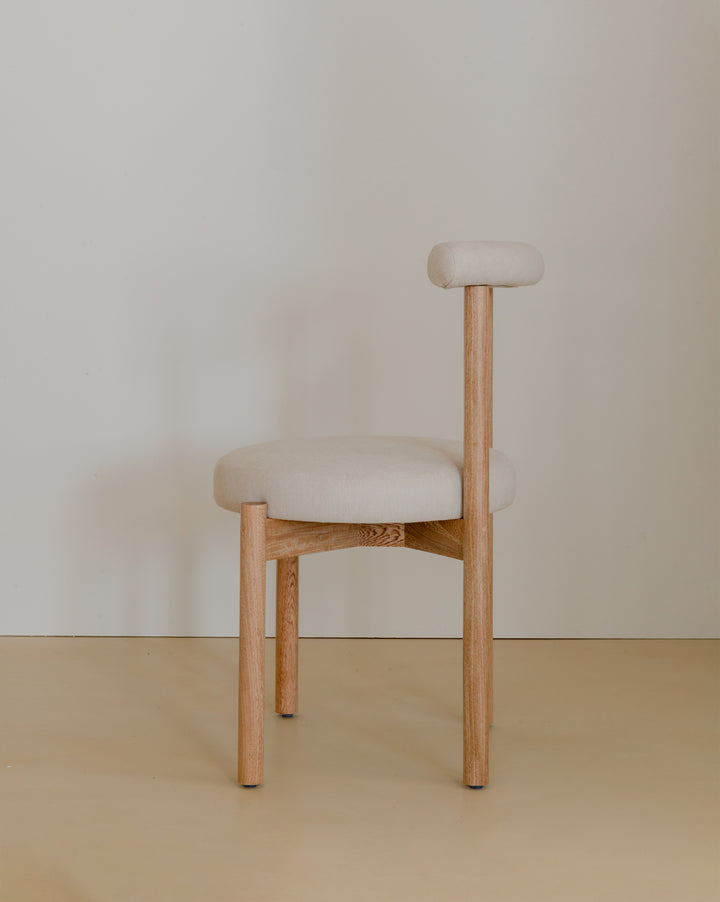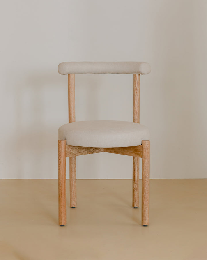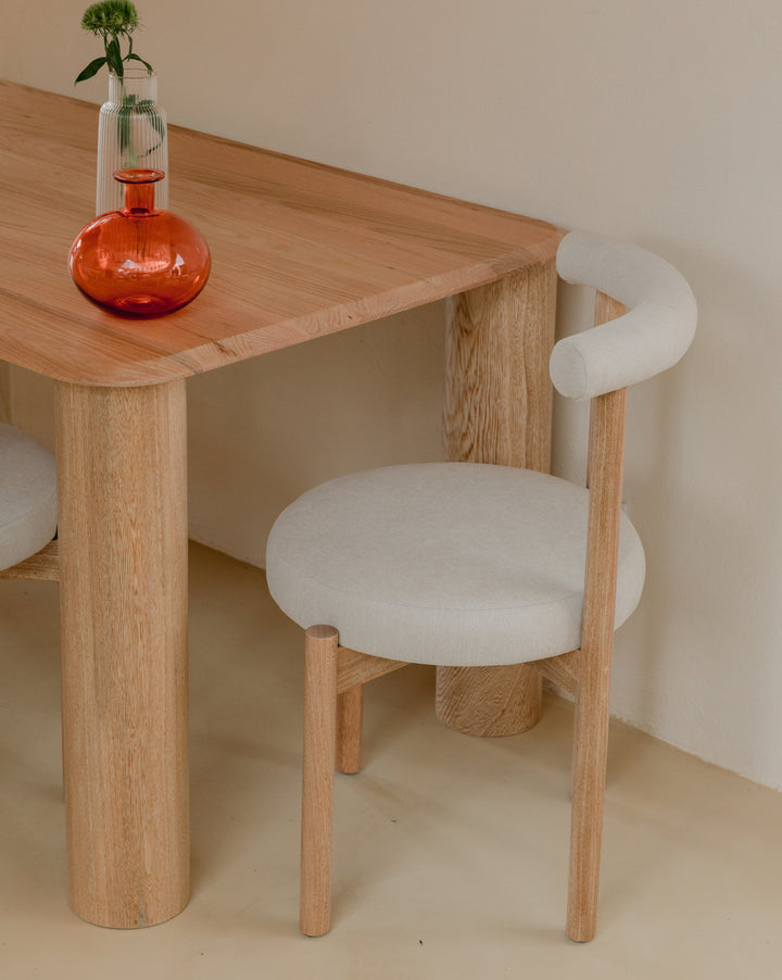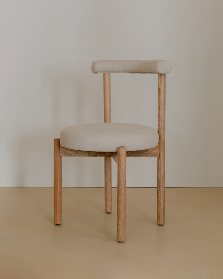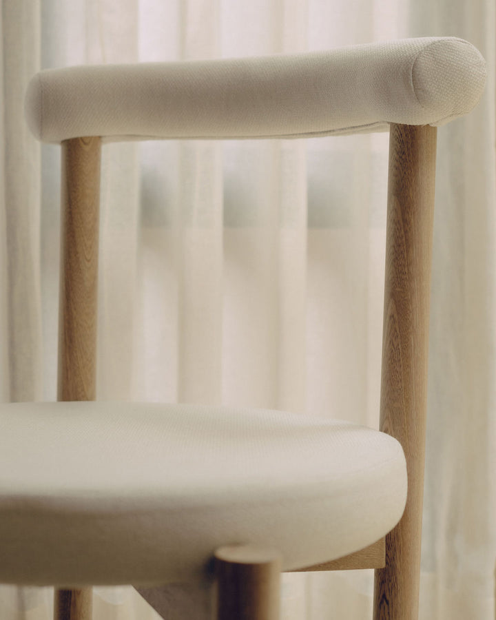 La Silla Flora cuenta con una estructura en madera de roble macizo, con acabado natural que resalta la veta del material, asiento y respaldo tapizados en tela, lo que ofrece una sensación cálida y confortable adecuada para uso en interiores.