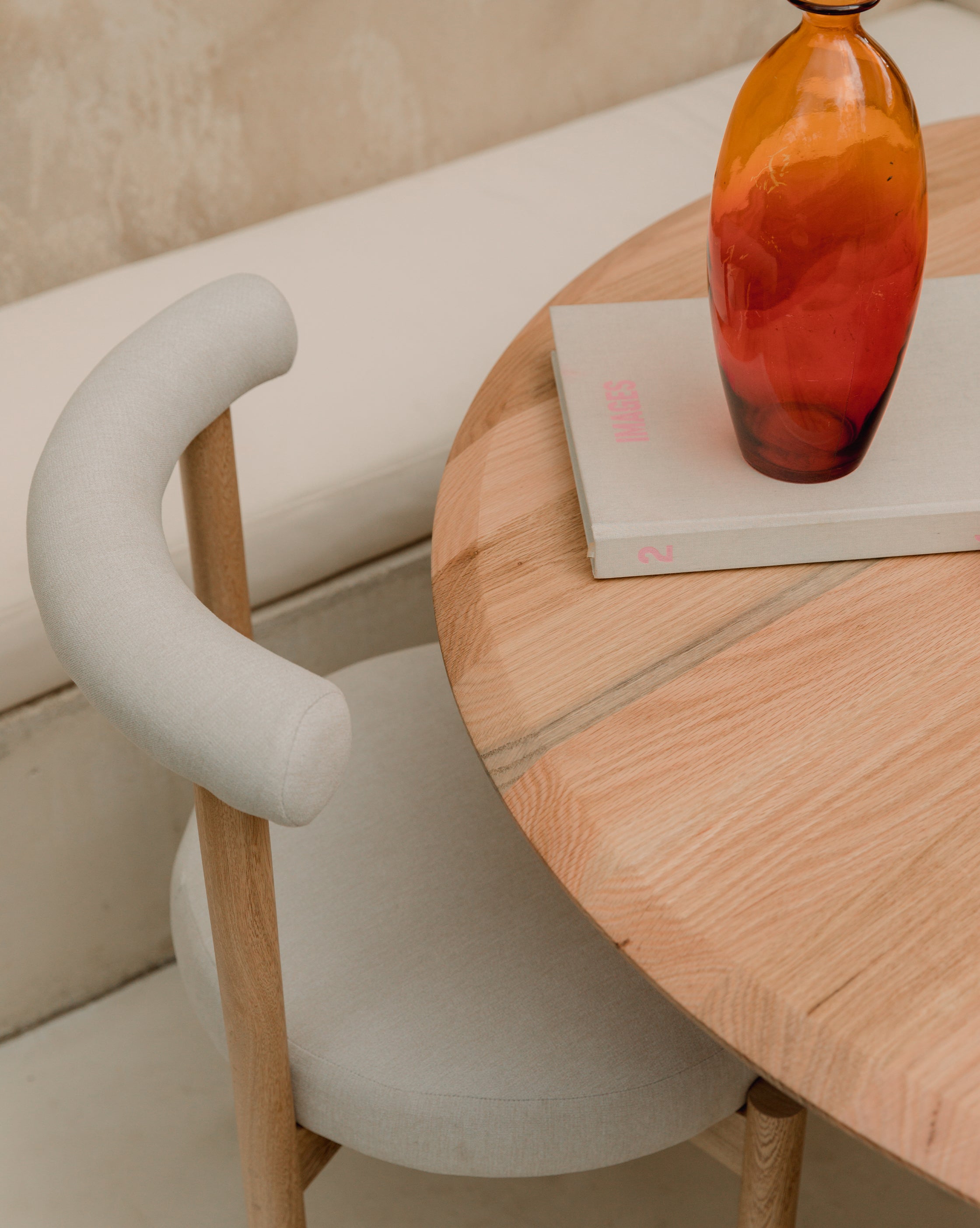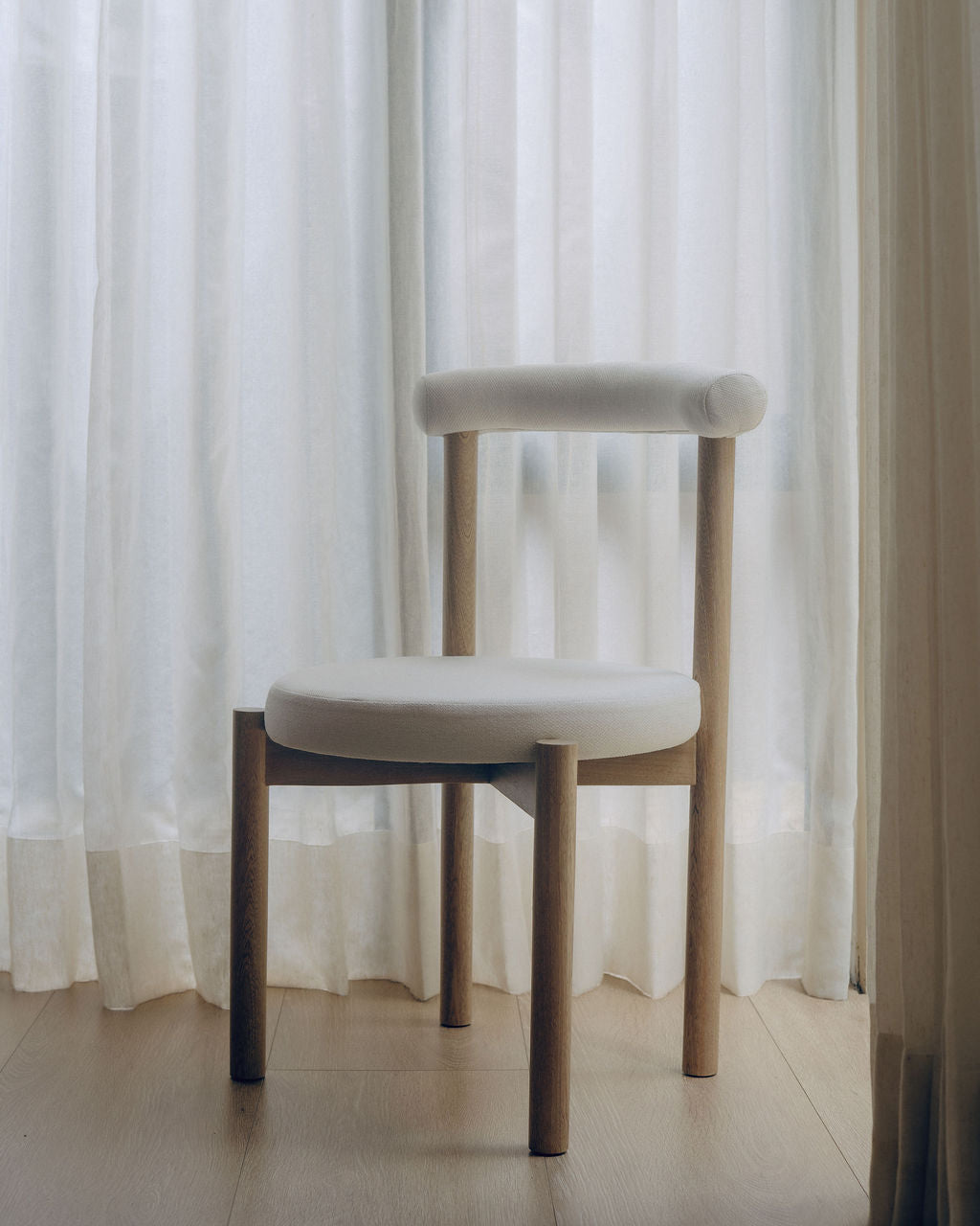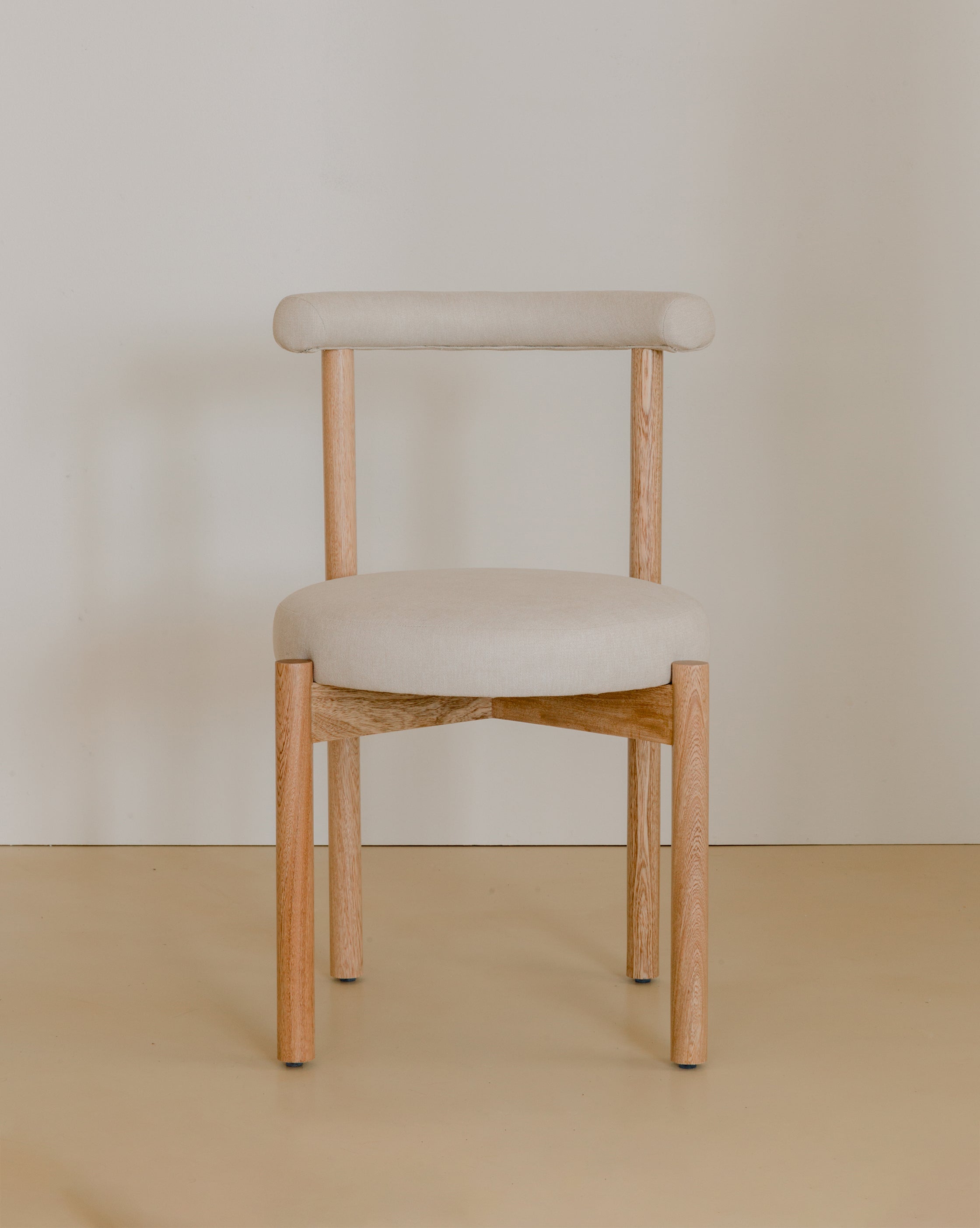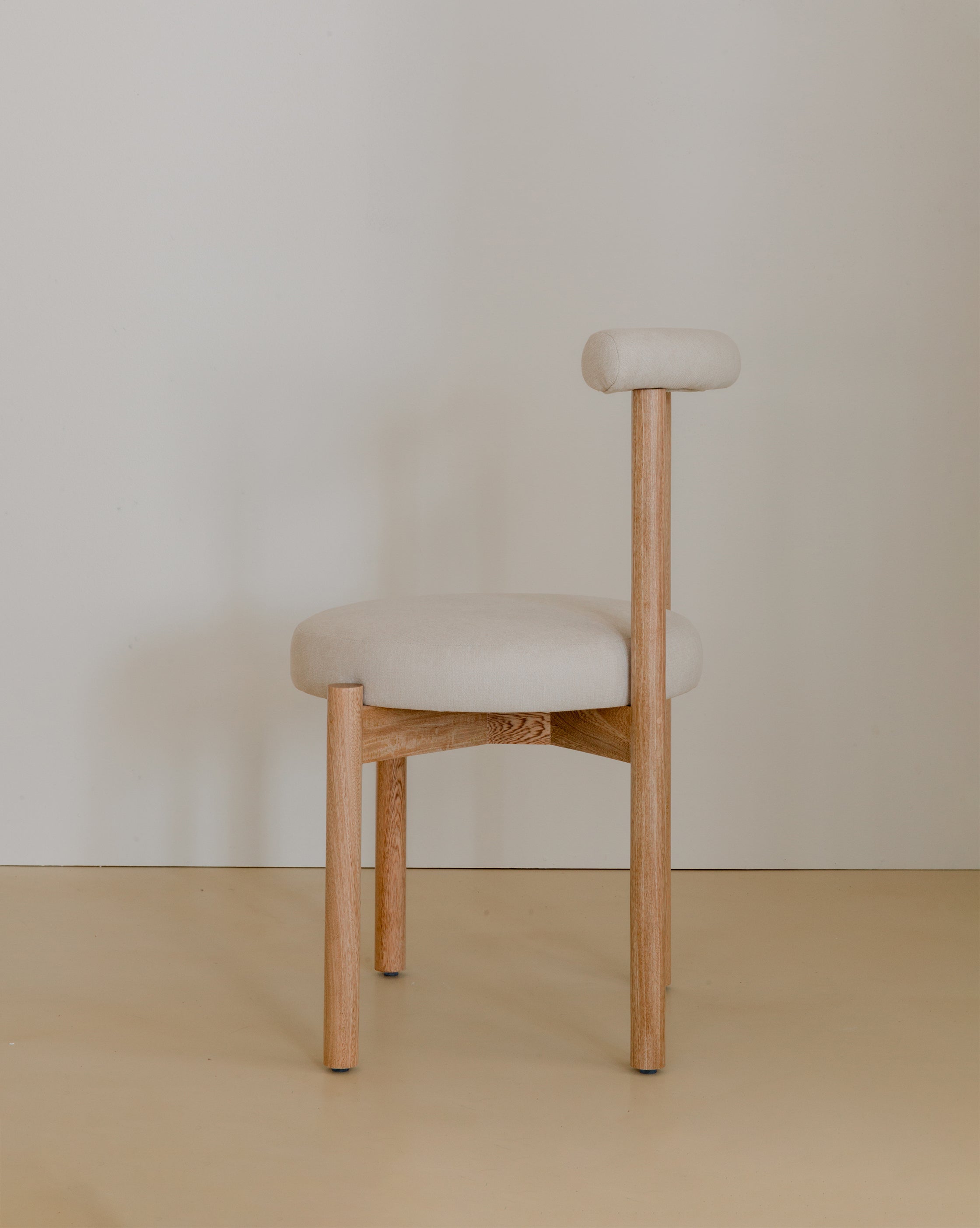 La Silla Flora cuenta con una estructura en madera de roble macizo, con acabado natural que resalta la veta del material, asiento y respaldo tapizados en tela, lo que ofrece una sensación cálida y confortable adecuada para uso en interiores.
