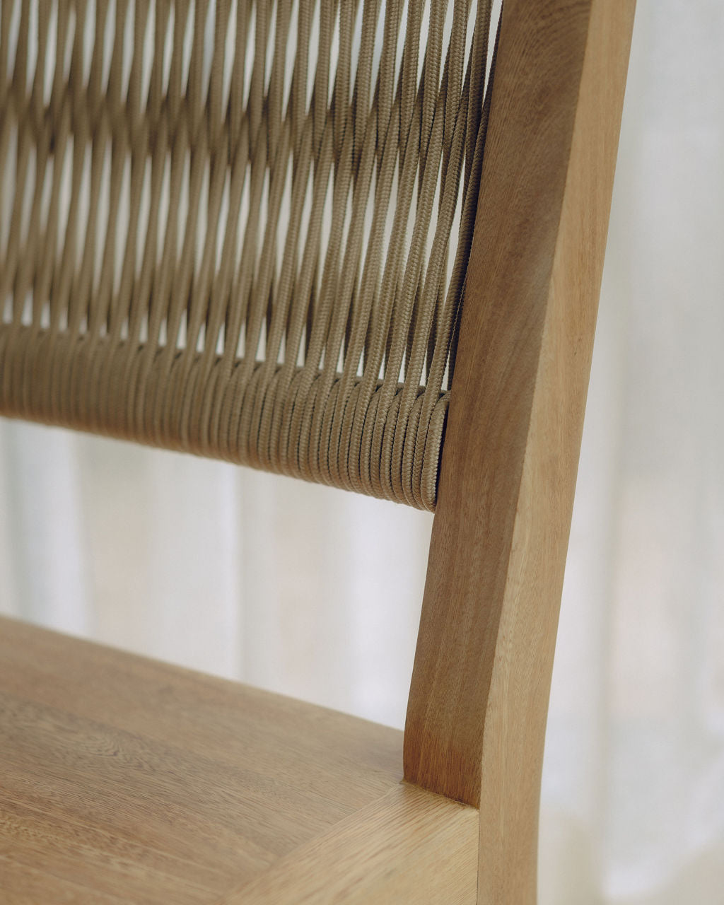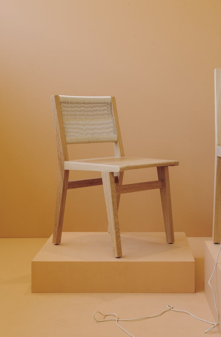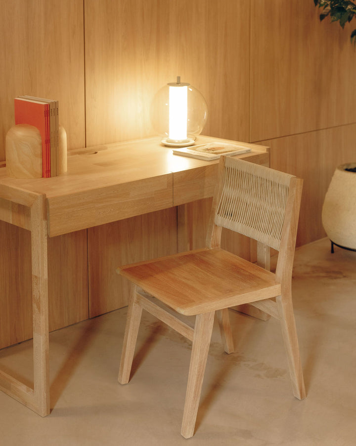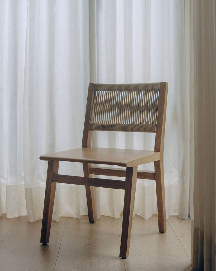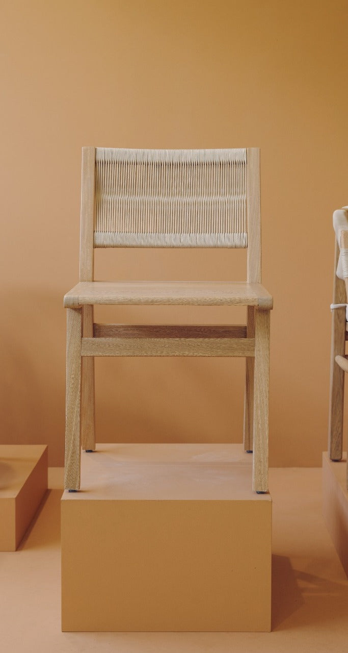 La Silla Treat cuenta con estructura y asiento en madera de roble macizo, con acabado natural que resalta la veta del material y espaldar tejido en fibra natural y la hace adecuada para uso en interiores.