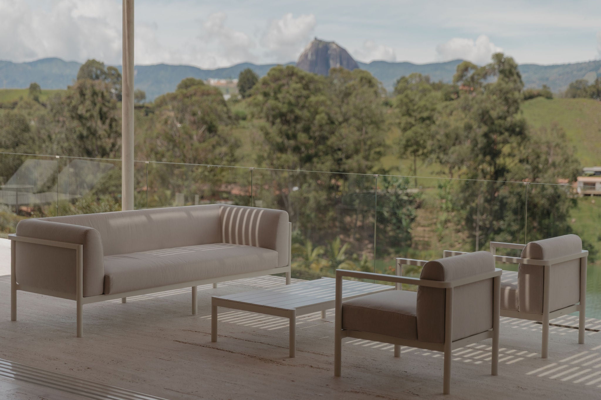 Sofá 3 puestos. Estructura de aluminio pintado en polvo Blanco Mineral 34 Cojín asiento y respaldo en espuma de poliuretano de 35 kg alta resistencia.