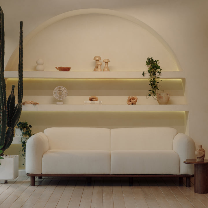 El sofá Homey es monolítico y cuenta con una estructura interna en madera, tapizada en tela y base en madera de roble maciza con acabado en tono chocolate, lo que lo hace adecuado para uso en interiores.