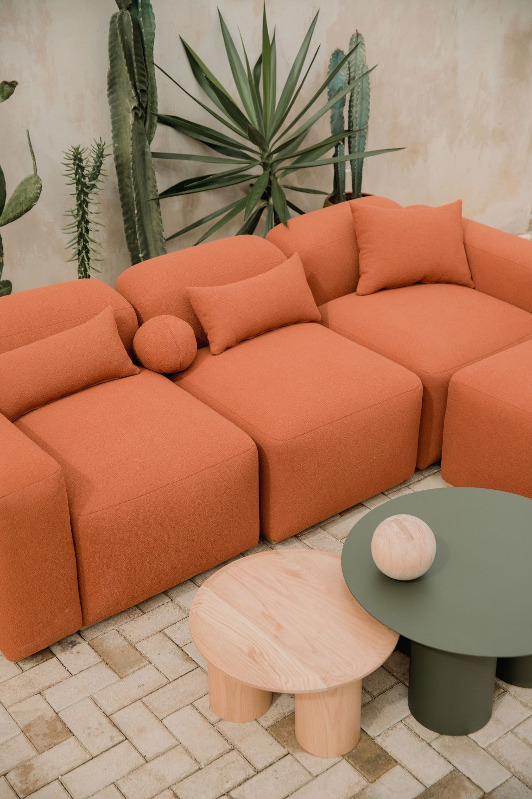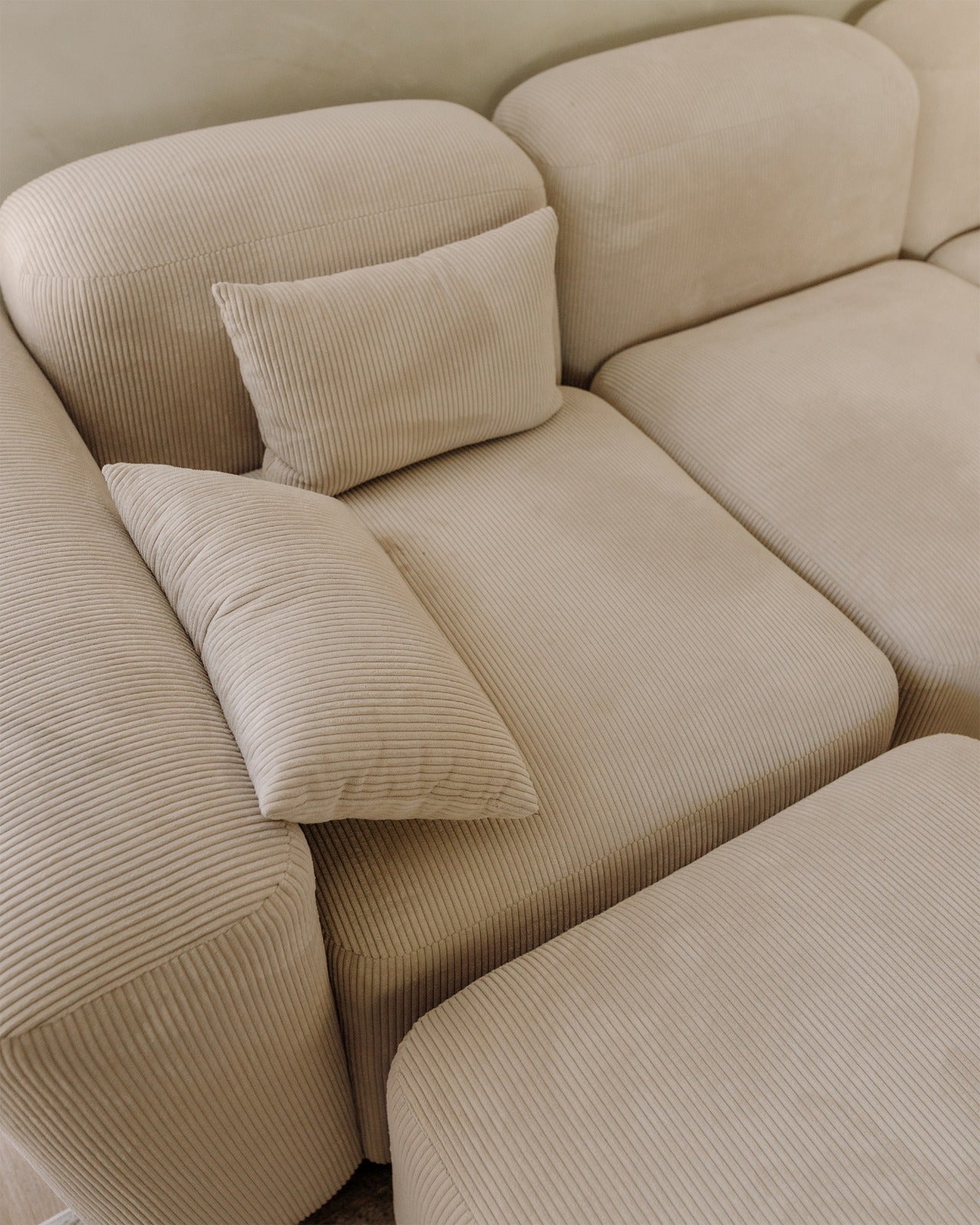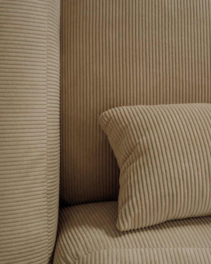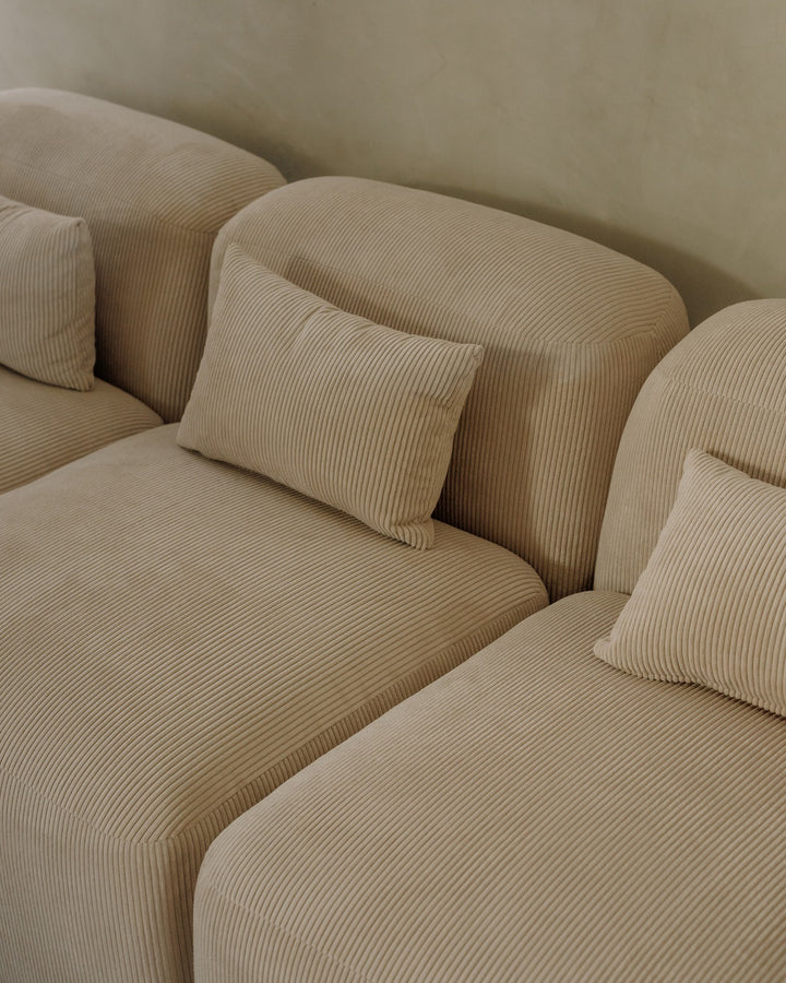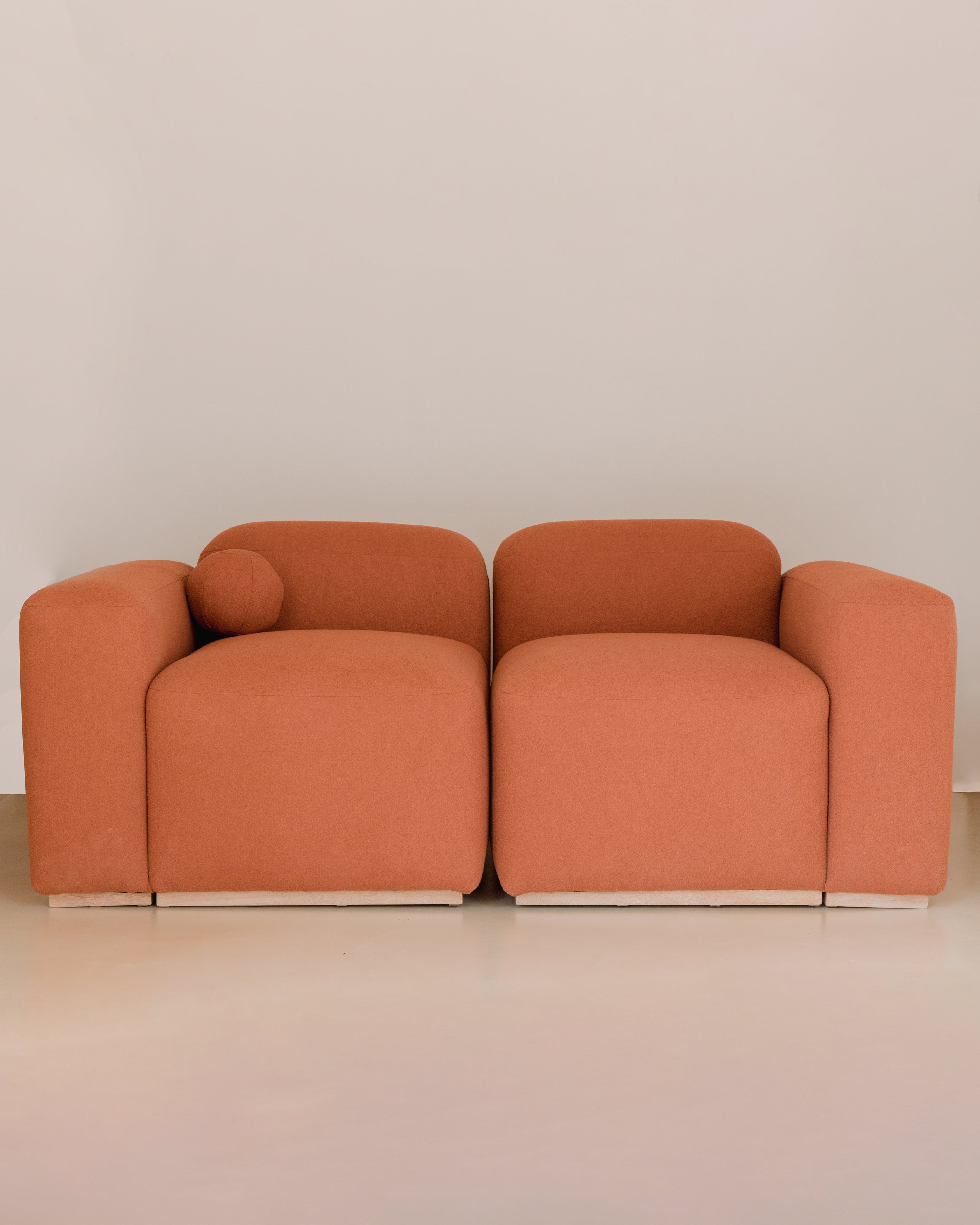 Su diseño es modular, lo que permite múltiples configuraciones y genera composiciones lineales, alargadas o envolventes. Se adapta a diferentes tamaños de espacios como áreas sociales, zonas de encuentro o espacios de descanso. Se caracteriza por el contraste entre volúmenes robustos y terminaciones redondeadas. Su estilo lo convierte en una pieza funcional. Ideal para crear ambientes acogedores.