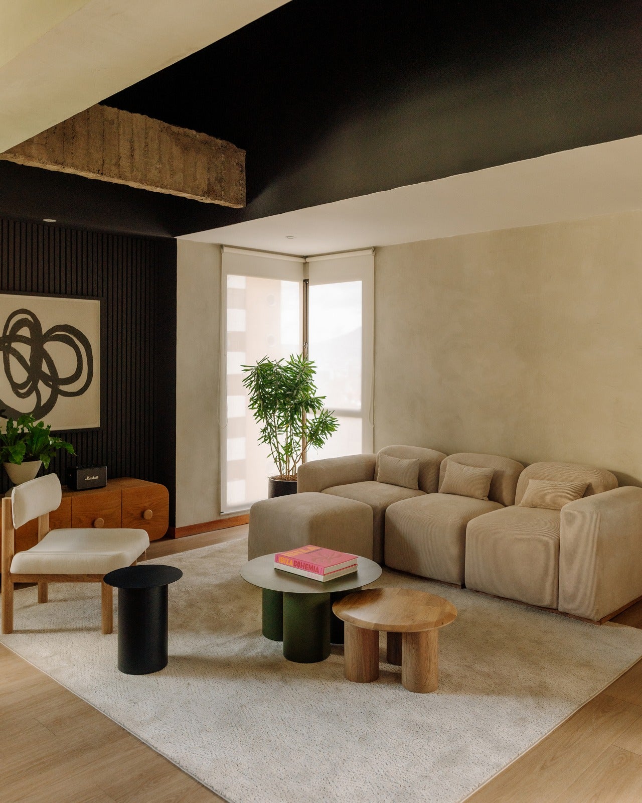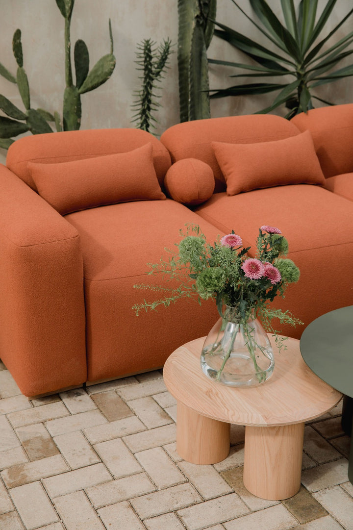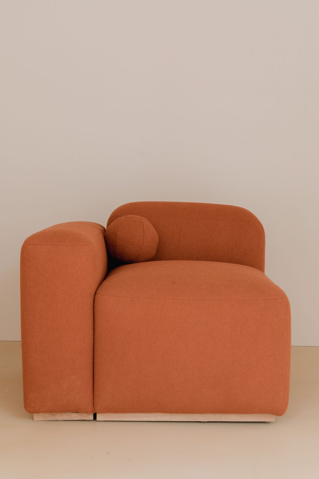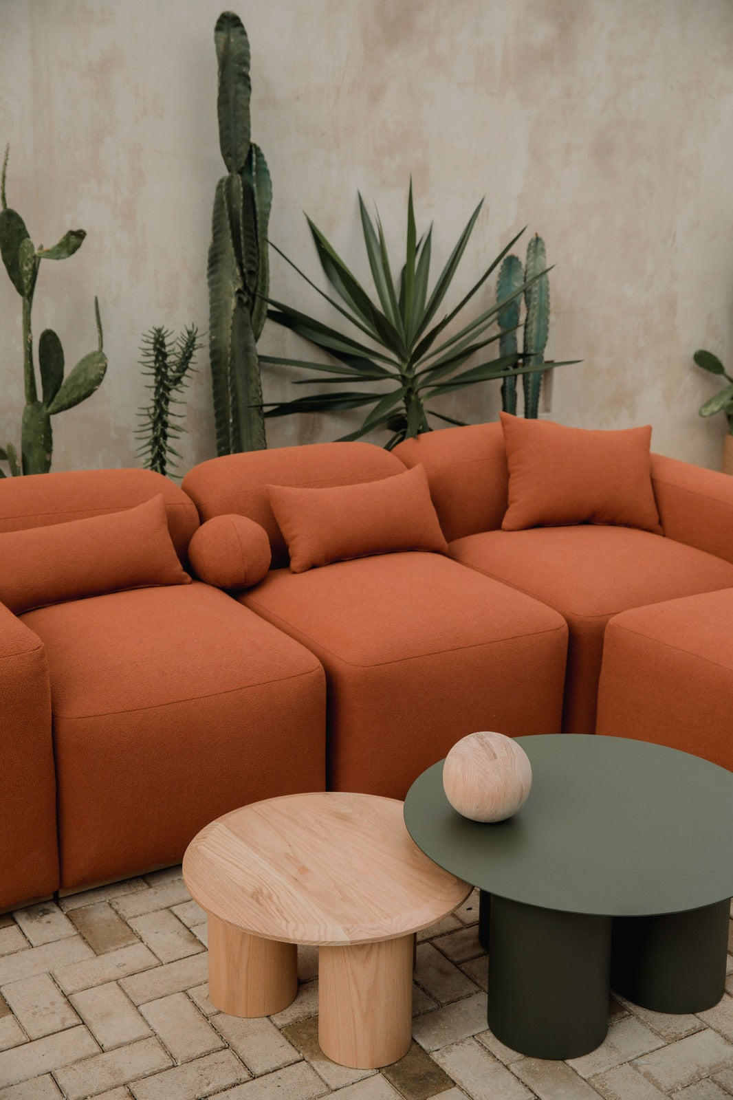 Su diseño es modular, lo que permite múltiples configuraciones y genera composiciones lineales, alargadas o envolventes. Se adapta a diferentes tamaños de espacios como áreas sociales, zonas de encuentro o espacios de descanso. Se caracteriza por el contraste entre volúmenes robustos y terminaciones redondeadas. Su estilo lo convierte en una pieza funcional. Ideal para crear ambientes acogedores.